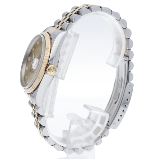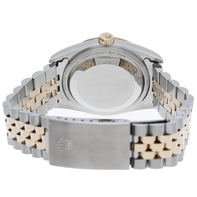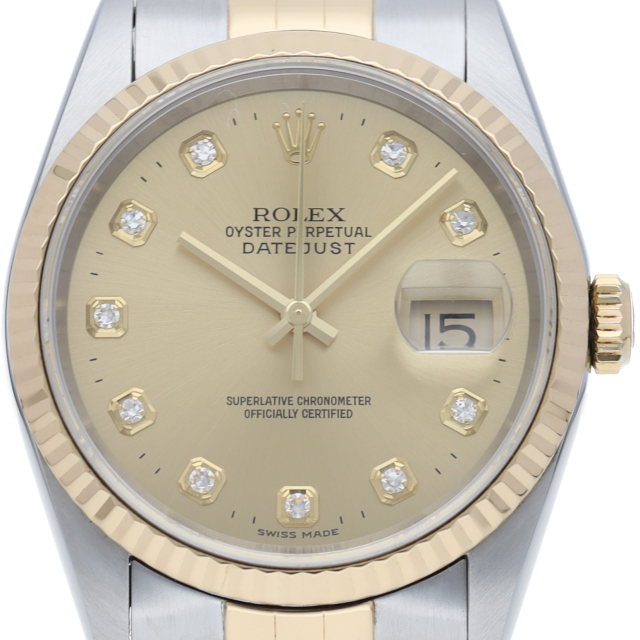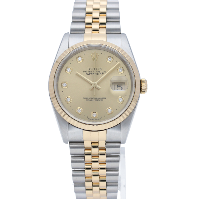 ロレックスのドレスウォッチで幅広い年齢層に愛されている「デイトジャスト」。イエローゴールドとステンレスのコンビ仕様に10Pダイヤが施されております。