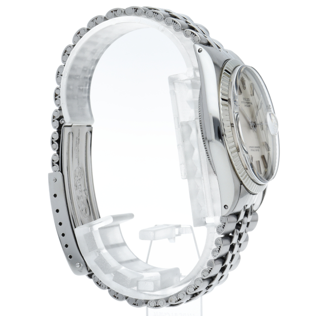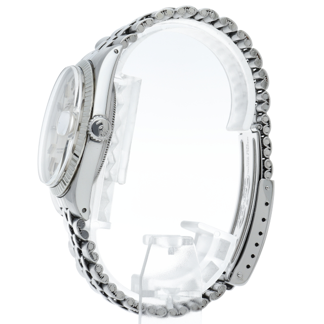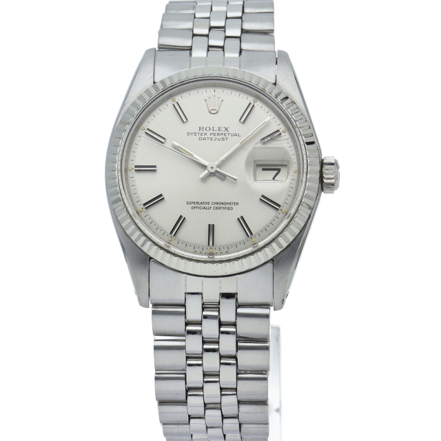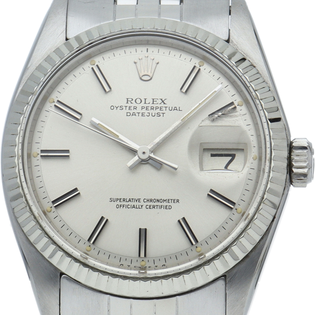 ロレックスのドレスウォッチの王道「デイトジャスト」。ホワイトゴールドとステンレスの組み合わせが高級感を感じさせる1本です。プラスチック風防仕様。こちらはワイドボーイ、通常よりも幅の広い針とインデックスが通称「Fat boy」とも呼ばれる希少文字盤です。