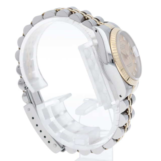 ロレックスのドレスウォッチで幅広い年齢層に愛されているデイトジャスト。イエローゴールドとステンレスのコンビ仕様に10Pダイヤが施され豪華です。
