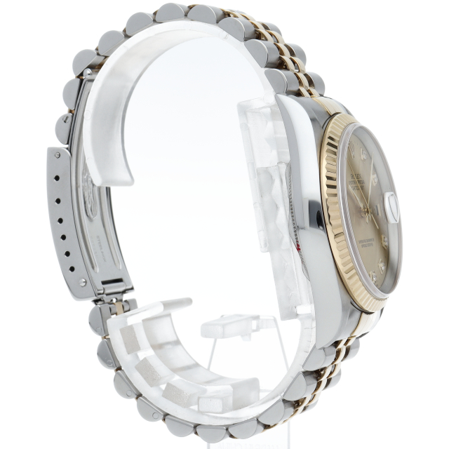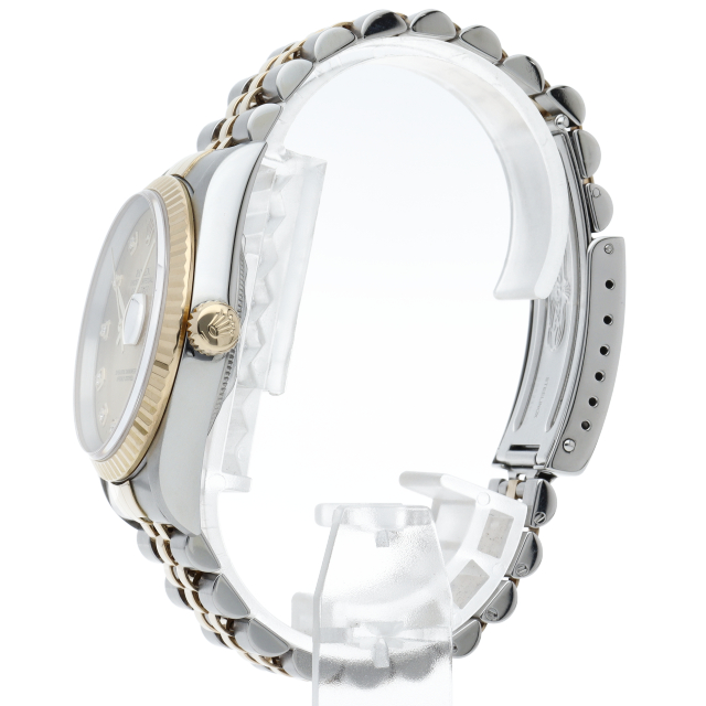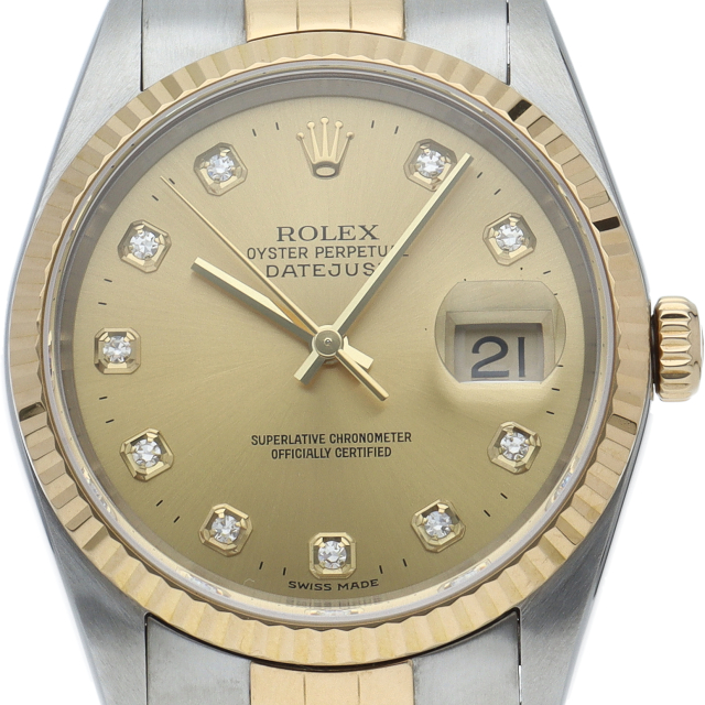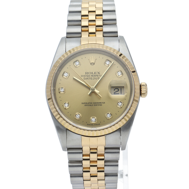 ロレックスのドレスウォッチで幅広い年齢層に愛されている「デイトジャスト」。イエローゴールドとステンレスのコンビ仕様に10Pダイヤが施されております。