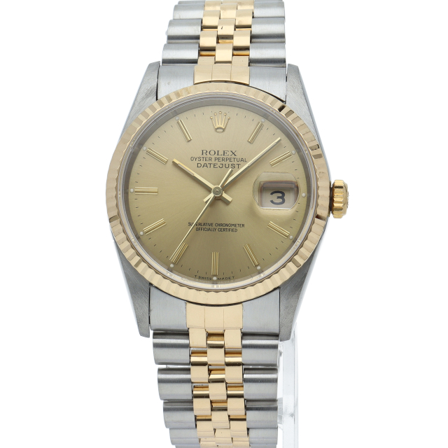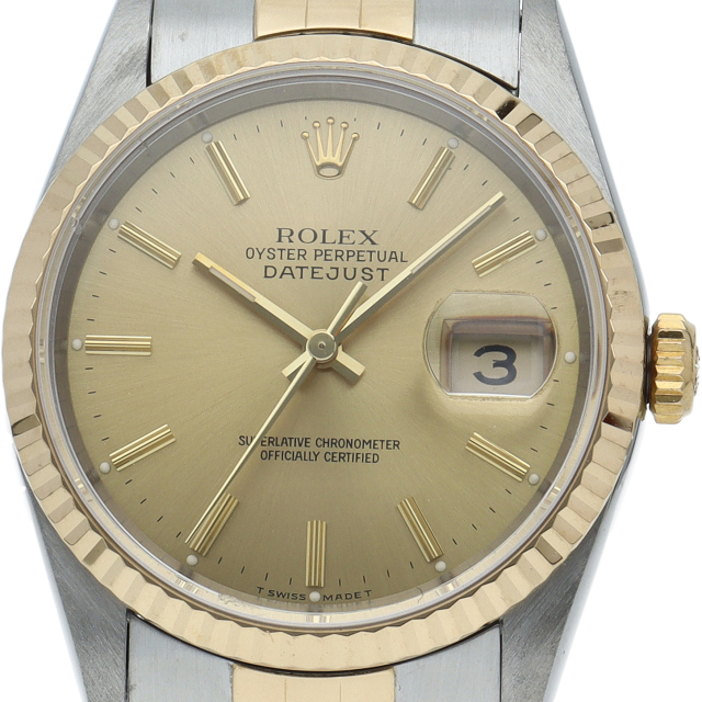 ロレックスのドレスウォッチの王道「デイトジャスト」。イエローゴールドとステンレスの組み合わせが上品で高級感を感じさせる1本です。