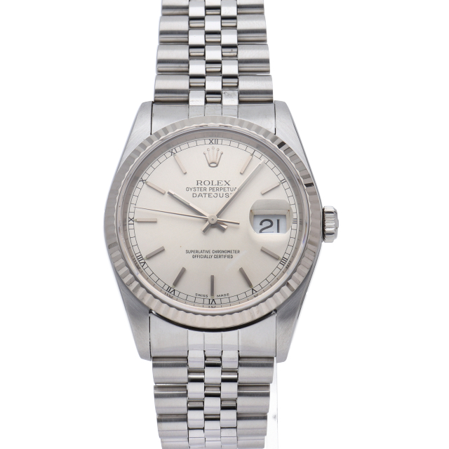 ロレックスのドレスウォッチの王道「デイトジャスト」。ホワイトゴールドとステンレスの組み合わせが高級感を感じさせる1本です。