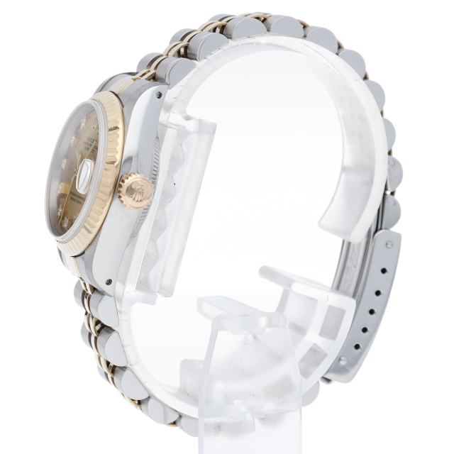 ロレックスのドレスウォッチで幅広い年齢層に愛されているデイトジャスト。イエローゴールドとステンレスのコンビ仕様に10Pダイヤが施され豪華です。