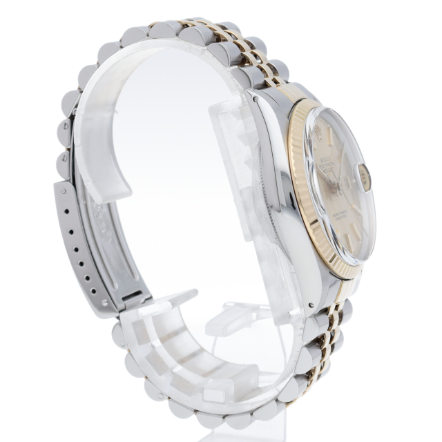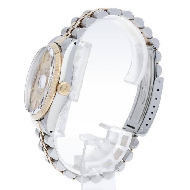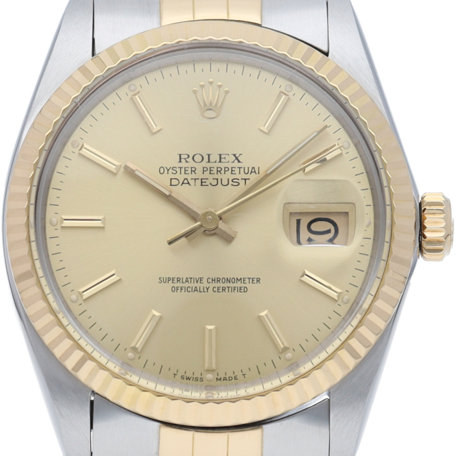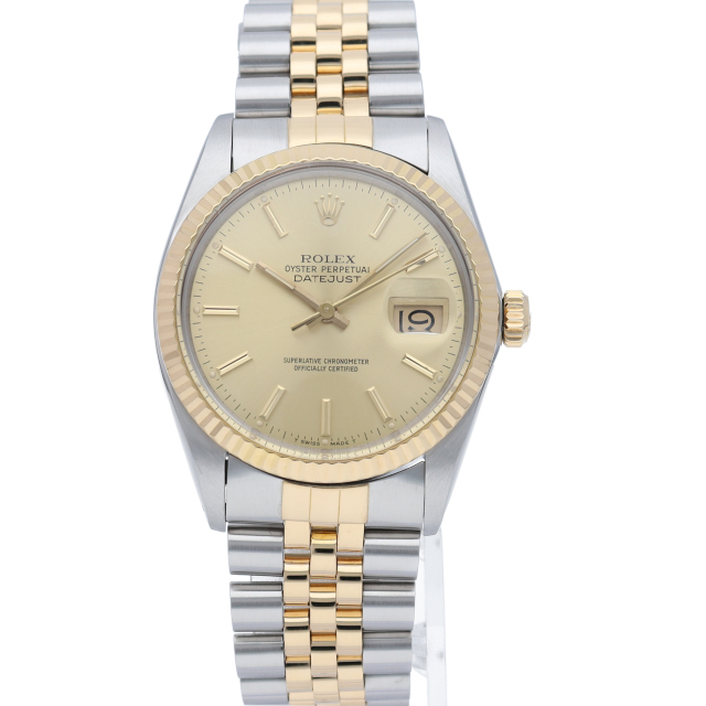 ロレックスドレスウォッチの王道「デイトジャスト」。イエローゴールドとステンレスの組み合わせが高級感を感じさせる1本です。プラスチック風防仕様。