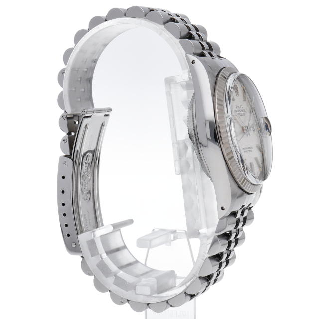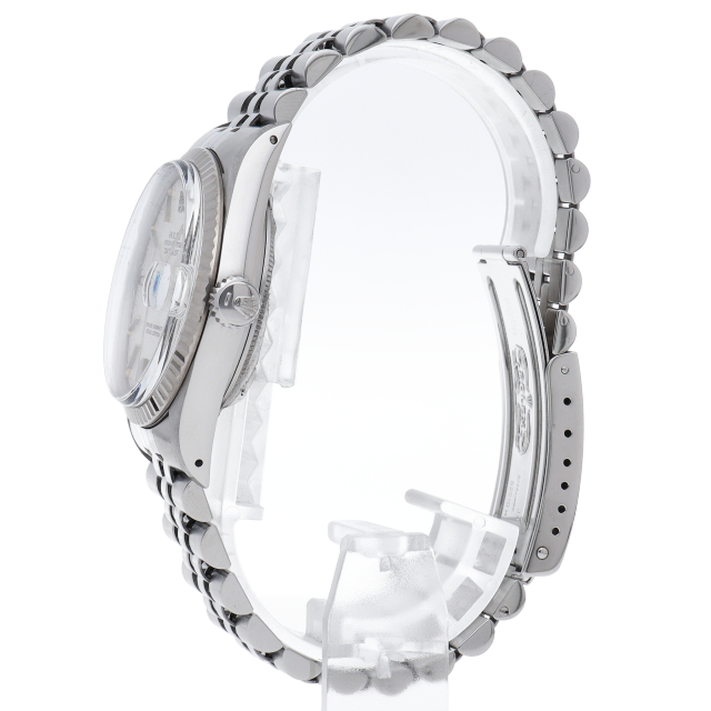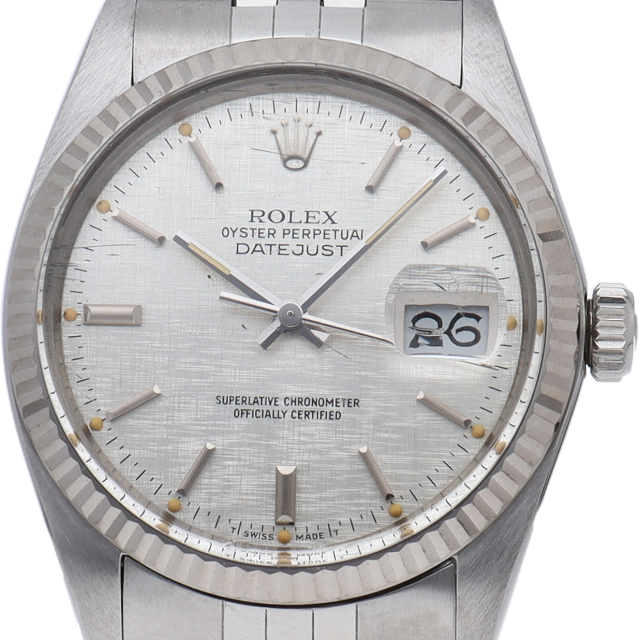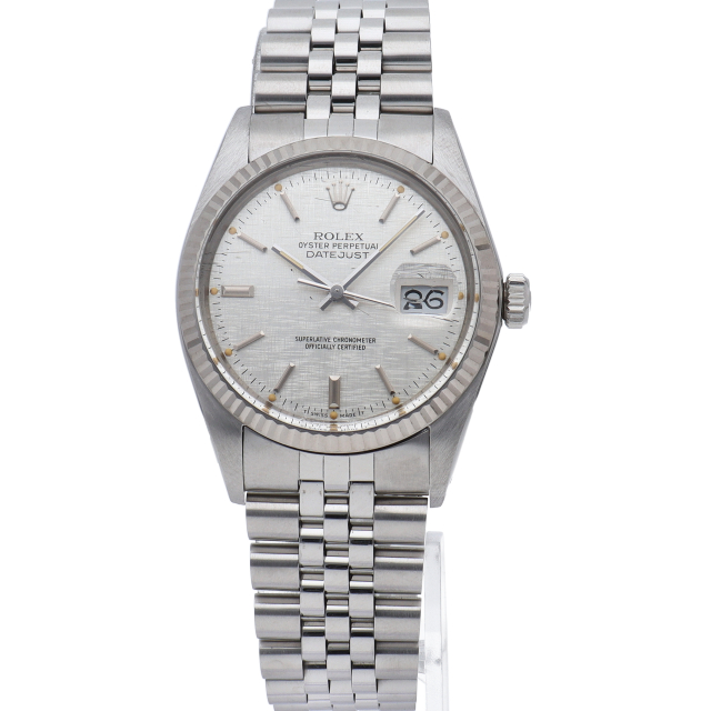 ロレックスのドレスウォッチの王道「デイトジャスト」。ホワイトゴールドとステンレスの組み合わせが高級感を感じさせる1本です。プラスチック風防仕様。