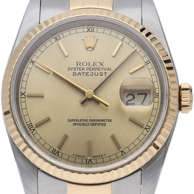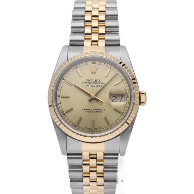 ロレックスのドレスウォッチの王道「デイトジャスト」。イエローゴールドとステンレスの組み合わせが上品で高級感を感じさせる1本です。