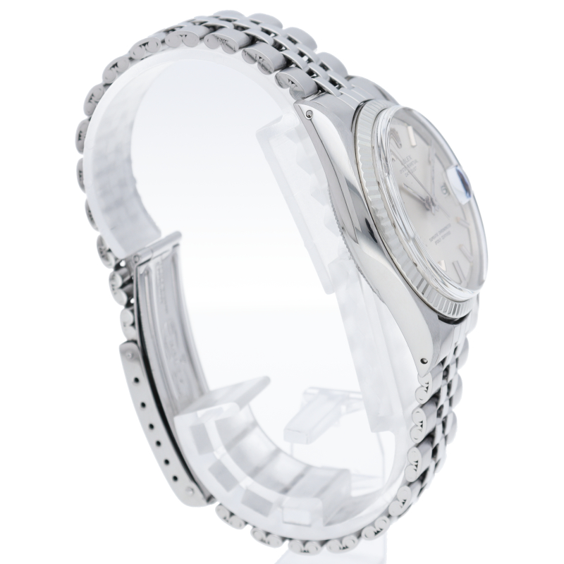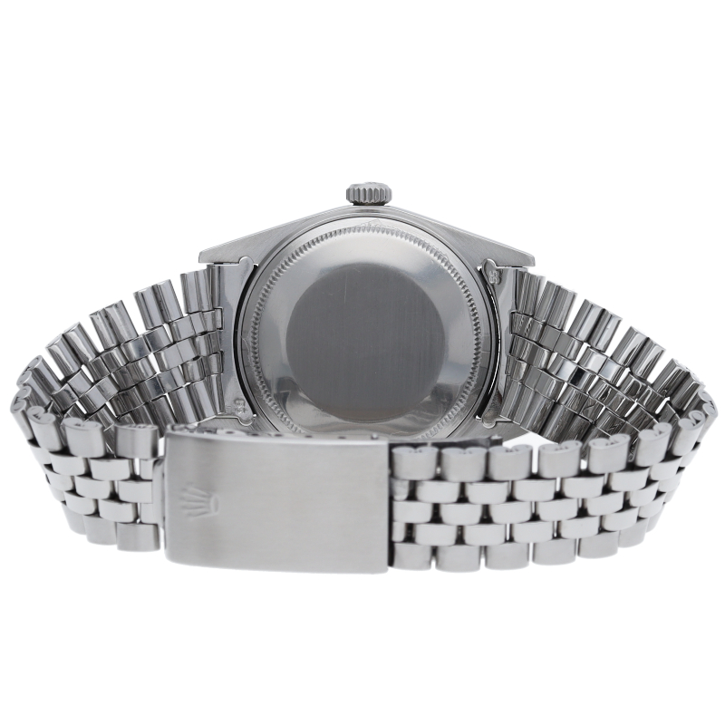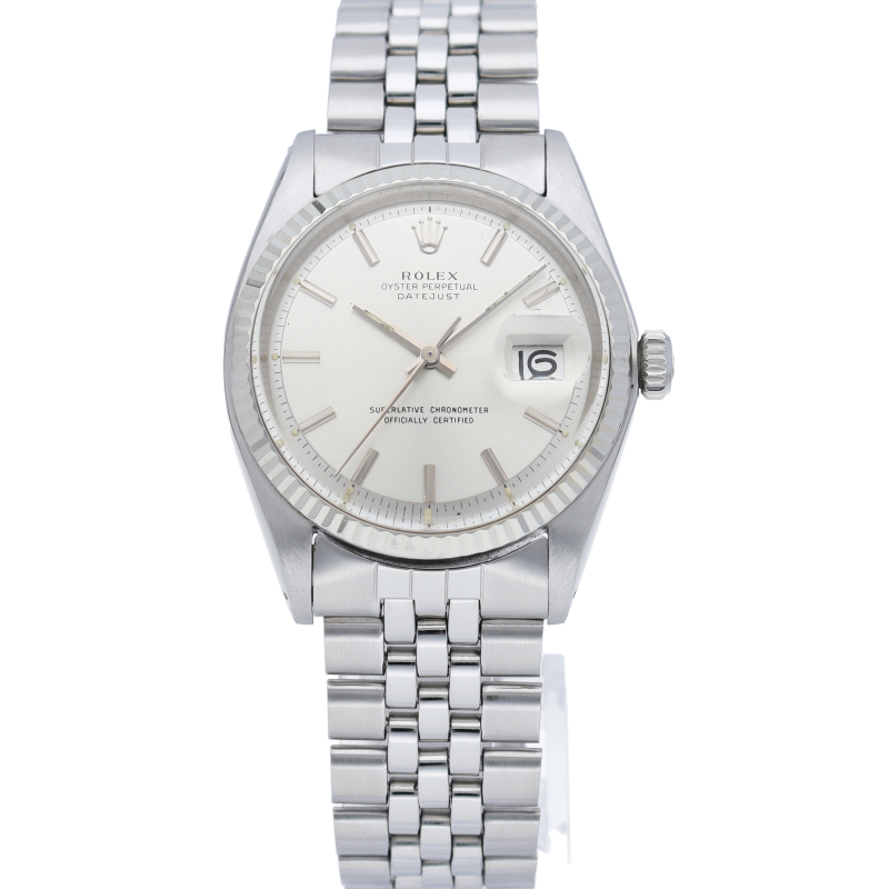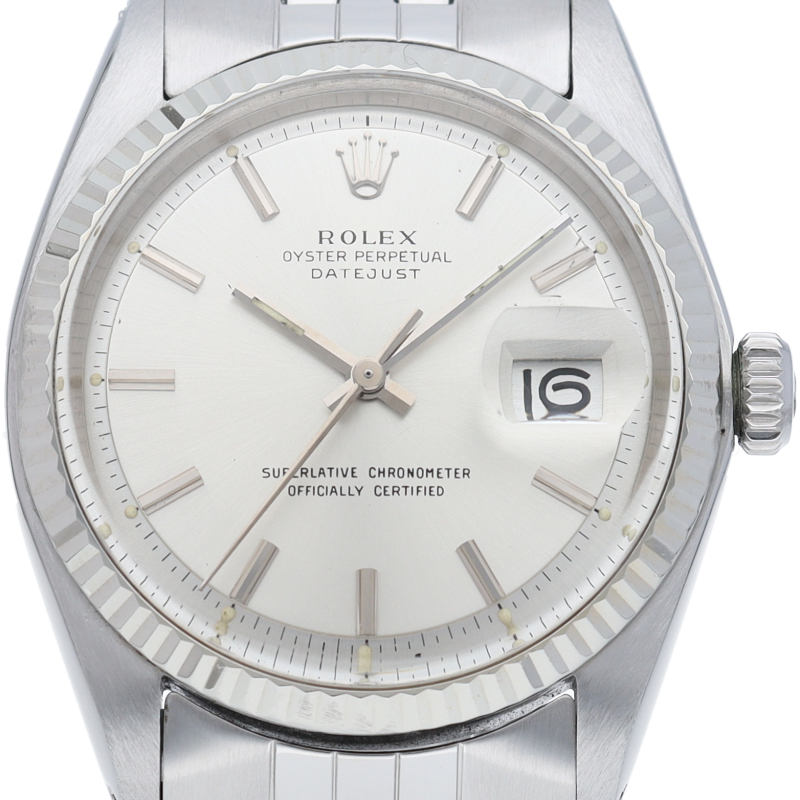 ロレックスのドレスウォッチの王道「デイトジャスト」。エンジンターンドベゼルのアンティーク感が逆に新鮮な1本。6時位置にインデックス等に貴金属が使用されている事を表すシグママークが入った、希少性・高級感の非常に高い1本です。