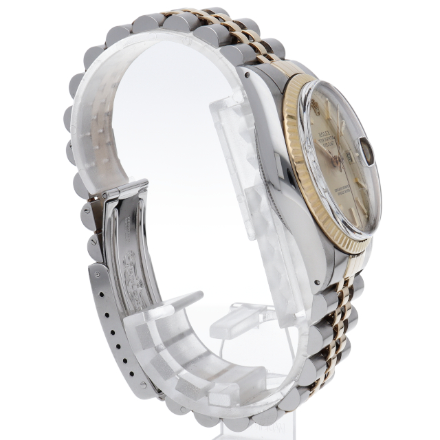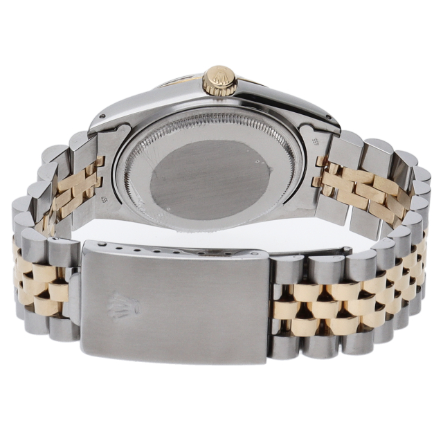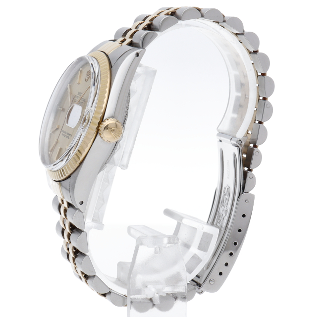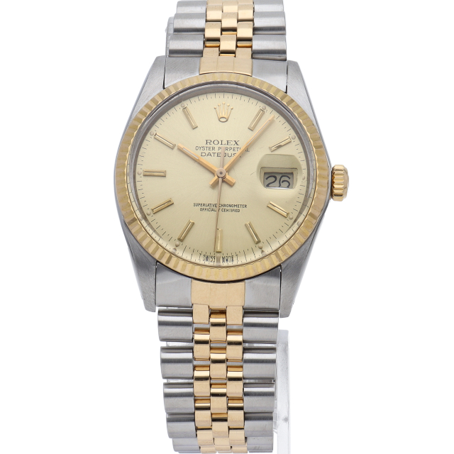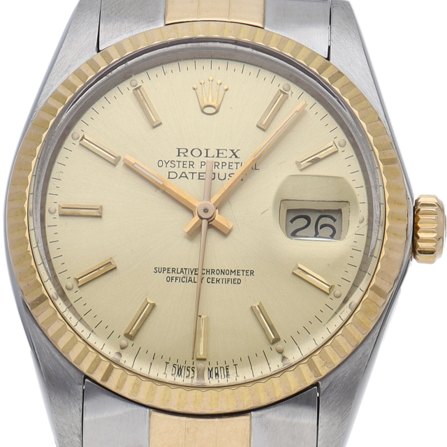 ロレックスドレスウォッチの王道「デイトジャスト」。イエローゴールドとステンレスの組み合わせが高級感を感じさせる1本です。プラスチック風防仕様。