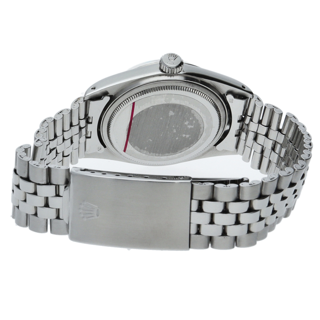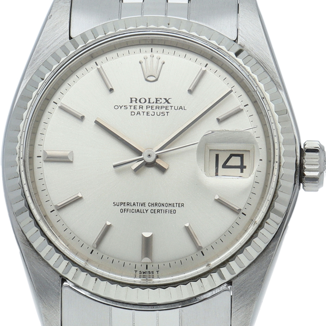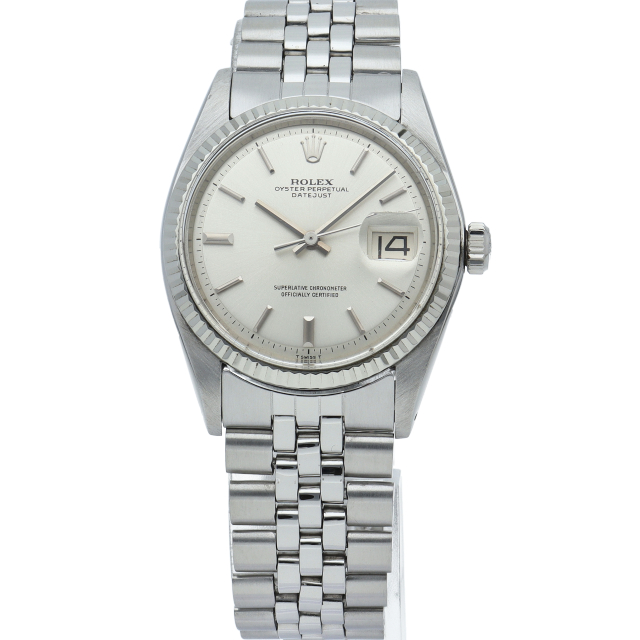 ロレックスのドレスウォッチの王道「デイトジャスト」。ホワイトゴールドとステンレスの組み合わせが高級感を感じさせる1本です。プラスチック風防仕様。こちらはワイドボーイ、通常よりも幅の広い針とインデックスが通称「Fat boy」とも呼ばれる希少文字盤です。