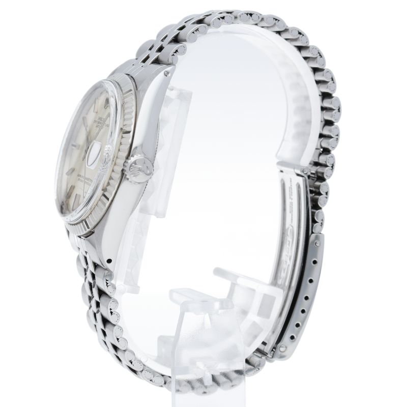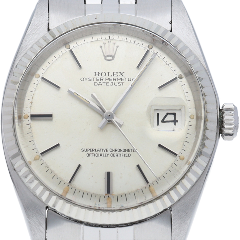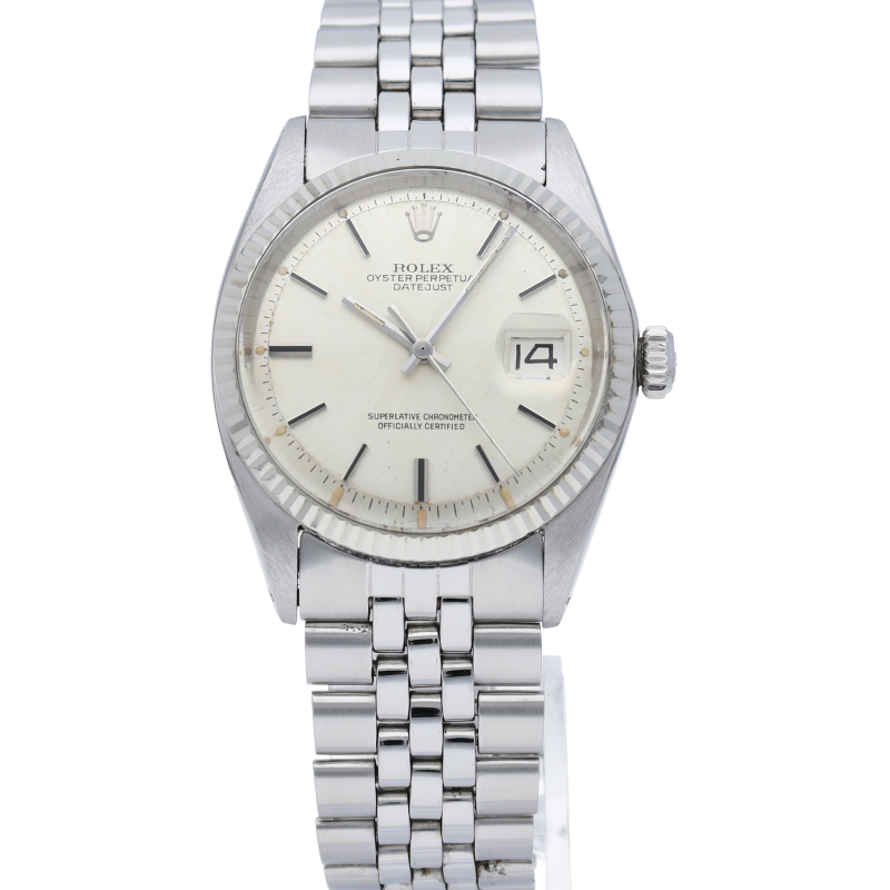 ロレックスの中でもシンプルな3針で時計本来の機能を追求した「オイスターパーペチュアルデイト」。洗練されたデザインはスタイルを選ばず使用できます。1960年代のアンティーク品です。6時位置にインデックス等に貴金属が使用されている事を表すシグママークが入った、希少性・高級感の非常に高い1本です。
