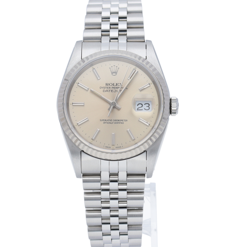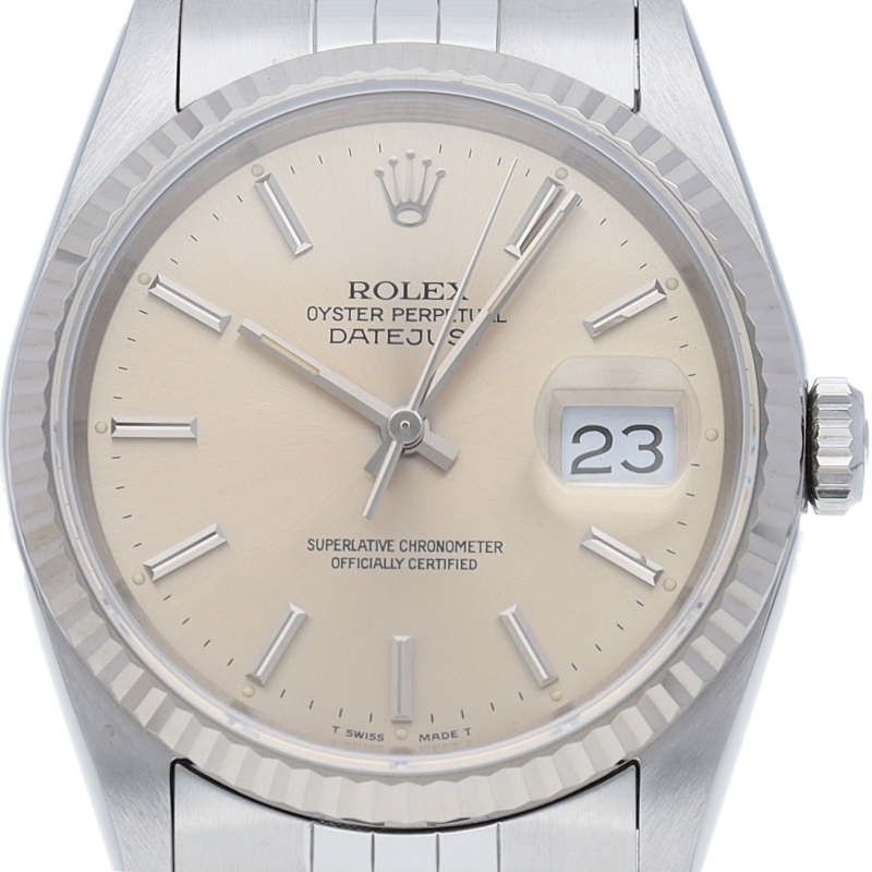 ロレックスのドレスウォッチの王道「デイトジャスト」。ホワイトゴールドとステンレスの組み合わせが高級感を感じさせる1本です。
