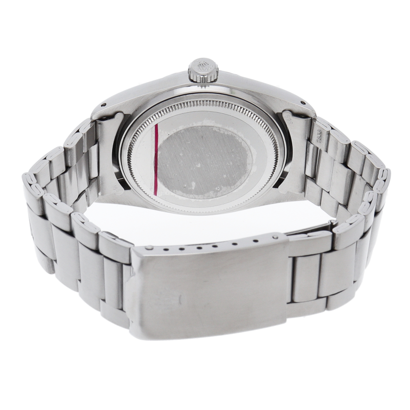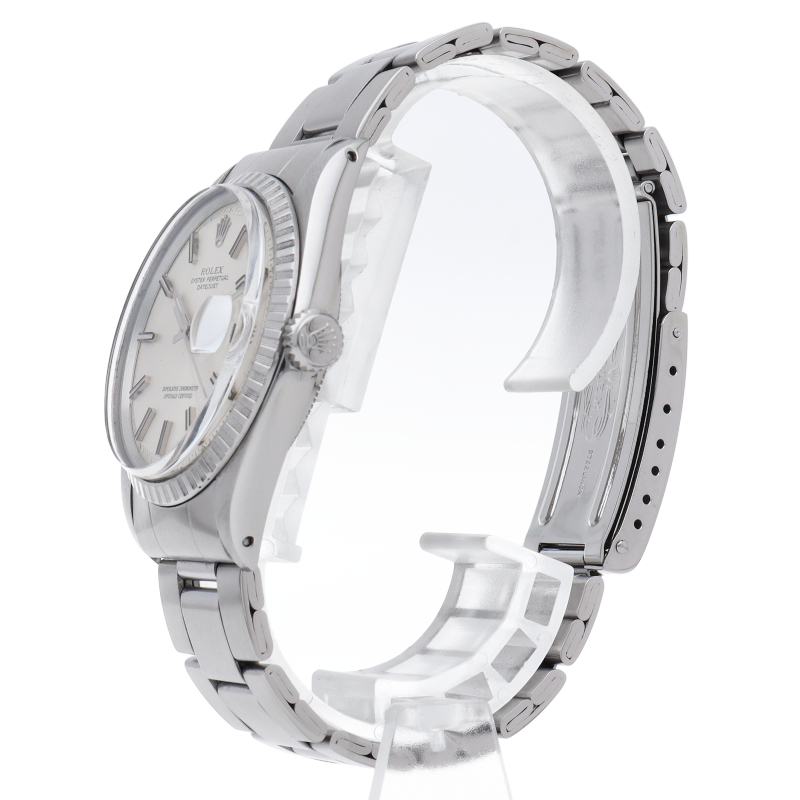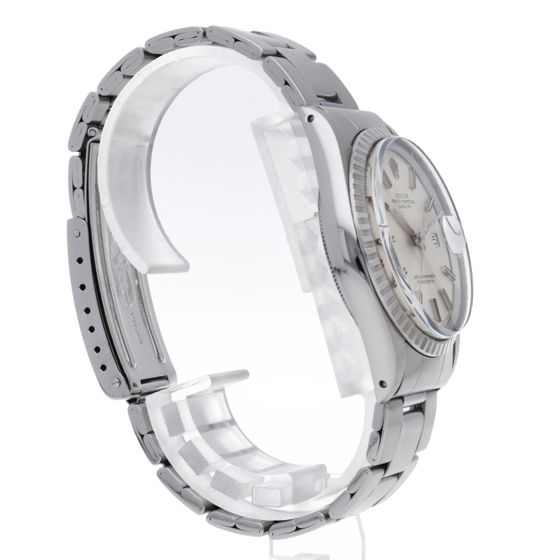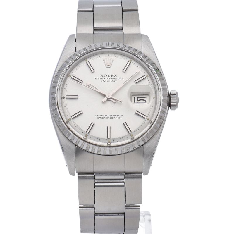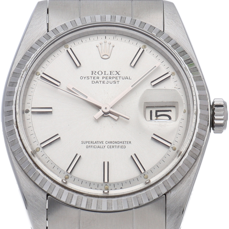 ロレックスのドレスウォッチの王道「デイトジャスト」。エンジンターンドベゼルのアンティーク感が逆に新鮮な1本。6時位置にインデックス等に貴金属が使用されている事を表すシグママークが入った、希少性・高級感の非常に高い1本です。