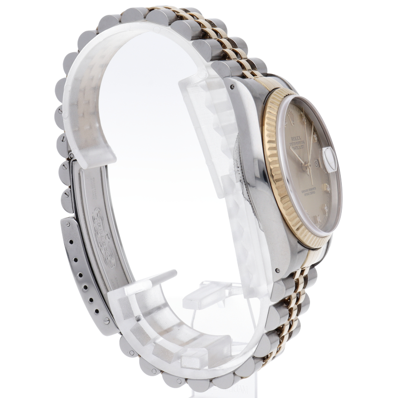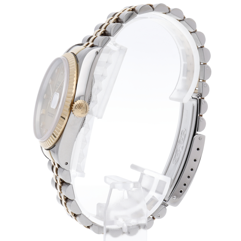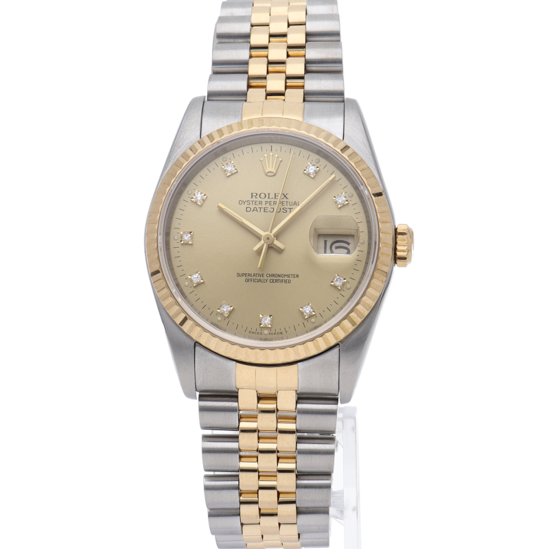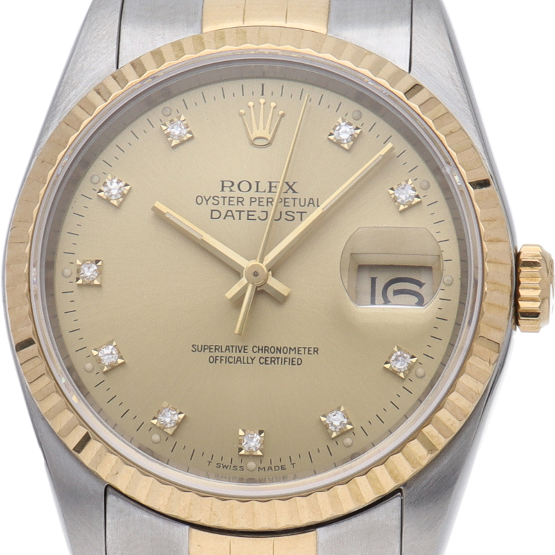 ロレックスのドレスウォッチで幅広い年齢層に愛されている「デイトジャスト」。イエローゴールドとステンレスのコンビ仕様に10Pダイヤが施されております。