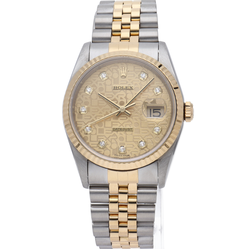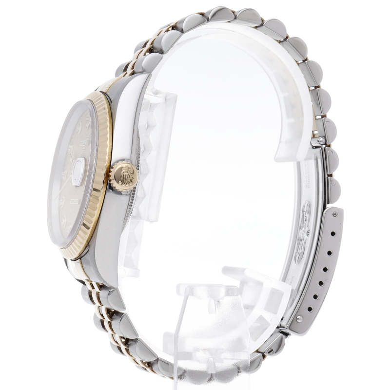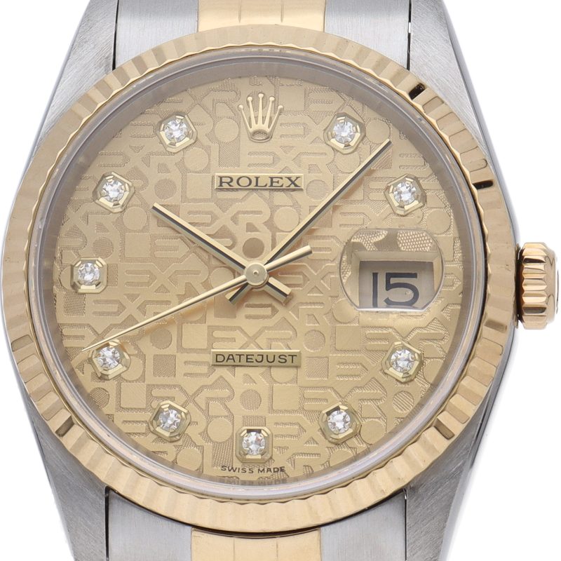 ロレックスのドレスウォッチで幅広い年齢層に愛されている「デイトジャスト」。イエローゴールドとステンレスのコンビ仕様に10Pダイヤが施されております。