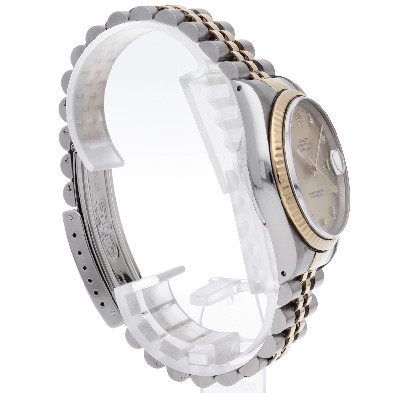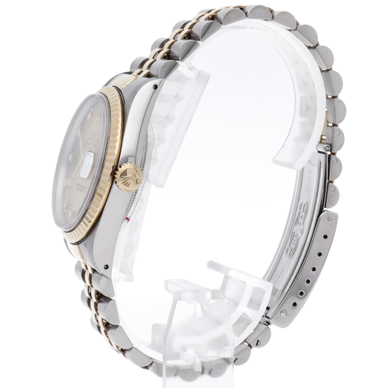 ロレックスのドレスウォッチで幅広い年齢層に愛されている「デイトジャスト」。イエローゴールドとステンレスのコンビ仕様に10Pダイヤが施されております。