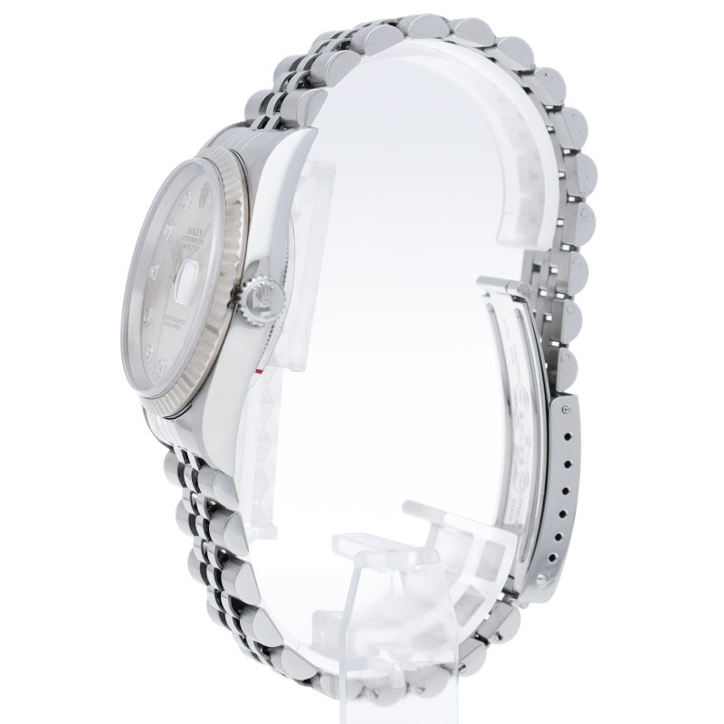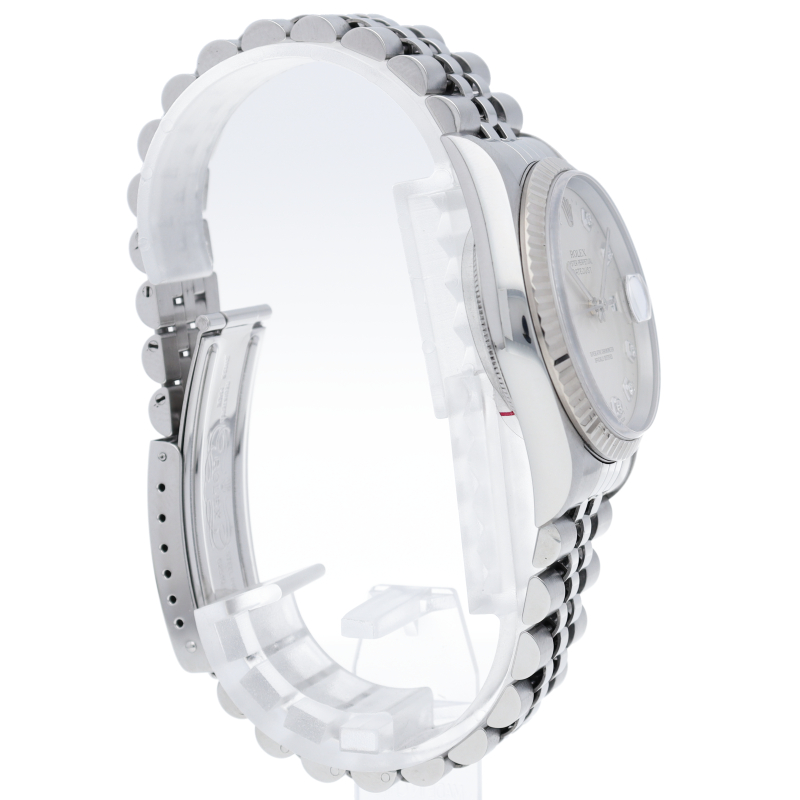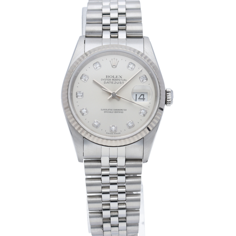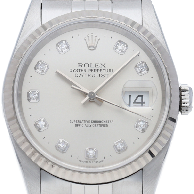 ロレックスのドレスウォッチで幅広い年齢層に愛されている「デイトジャスト」。ホワイトゴールドとステンレスのコンビ仕様に10Pダイヤが施されております。
