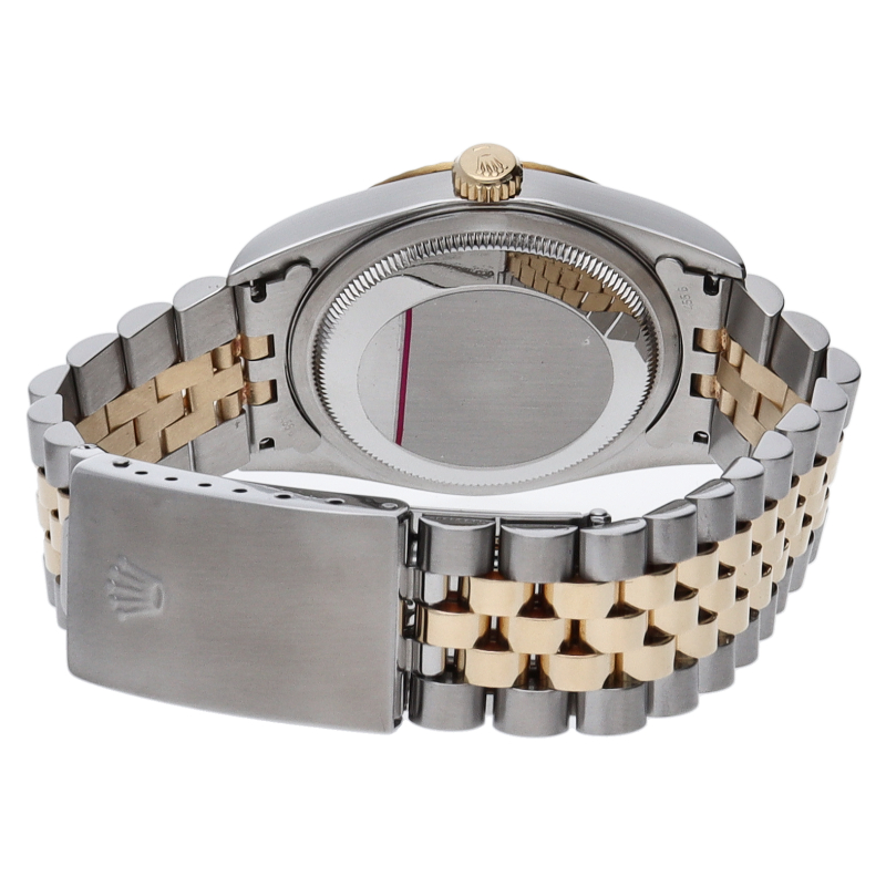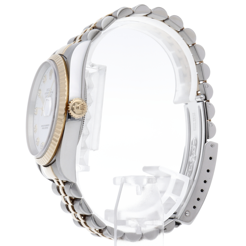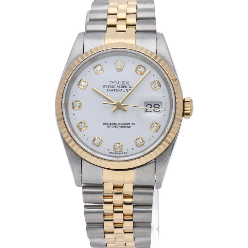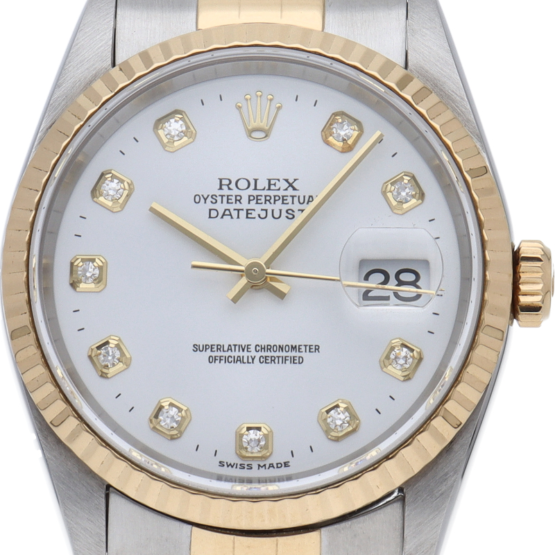 ロレックスのドレスウォッチで幅広い年齢層に愛されている「デイトジャスト」。イエローゴールドとステンレスのコンビ仕様に10Pダイヤが施されております。