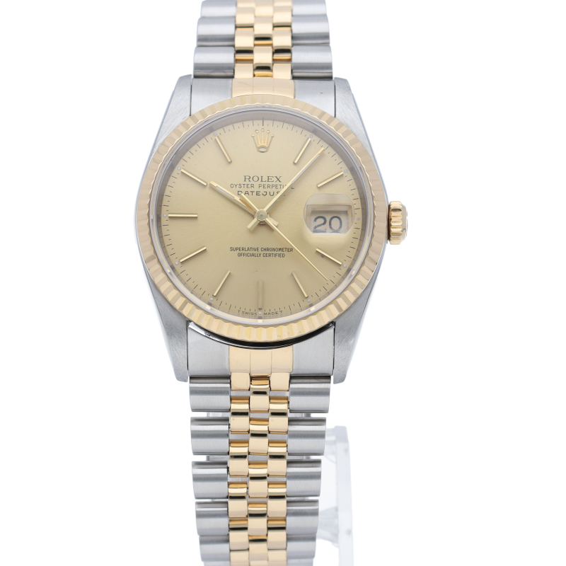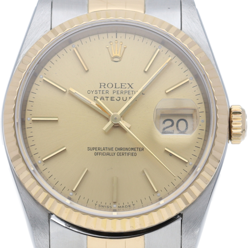 ロレックスのドレスウォッチの王道「デイトジャスト」。イエローゴールドとステンレスの組み合わせが上品で高級感を感じさせる1本です。