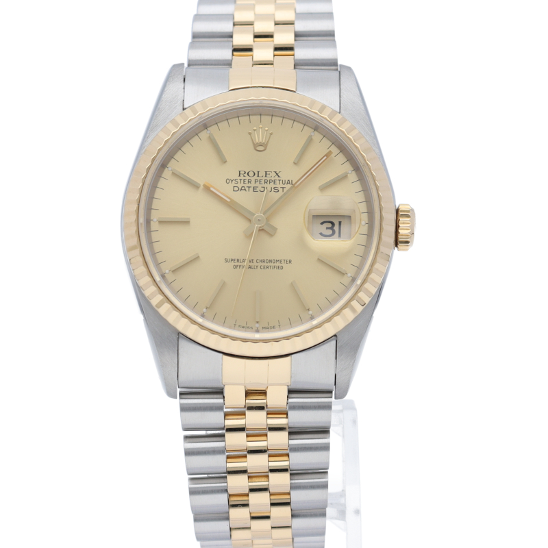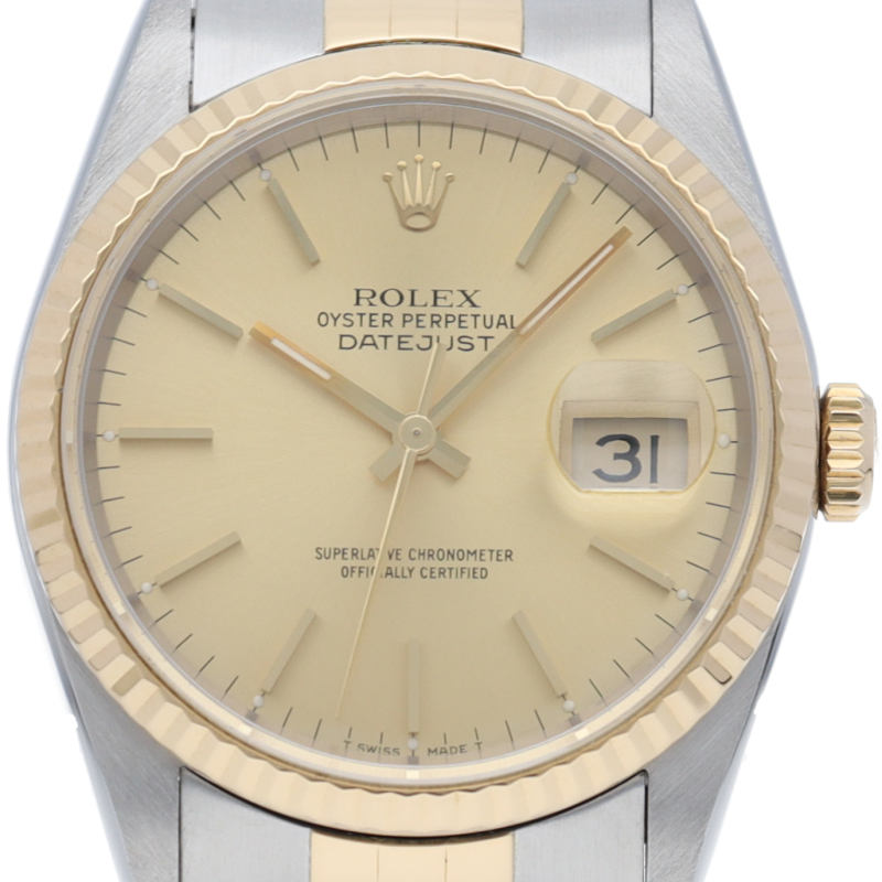 ロレックスのドレスウォッチの王道「デイトジャスト」。イエローゴールドとステンレスの組み合わせが上品で高級感を感じさせる1本です。