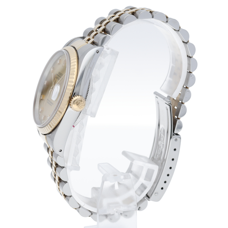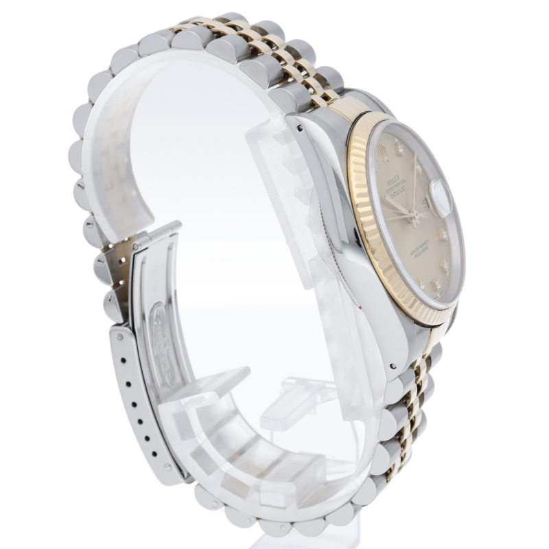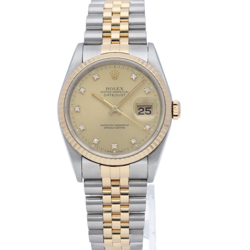 ロレックスのドレスウォッチで幅広い年齢層に愛されている「デイトジャスト」。イエローゴールドとステンレスのコンビ仕様に10Pダイヤが施されております。