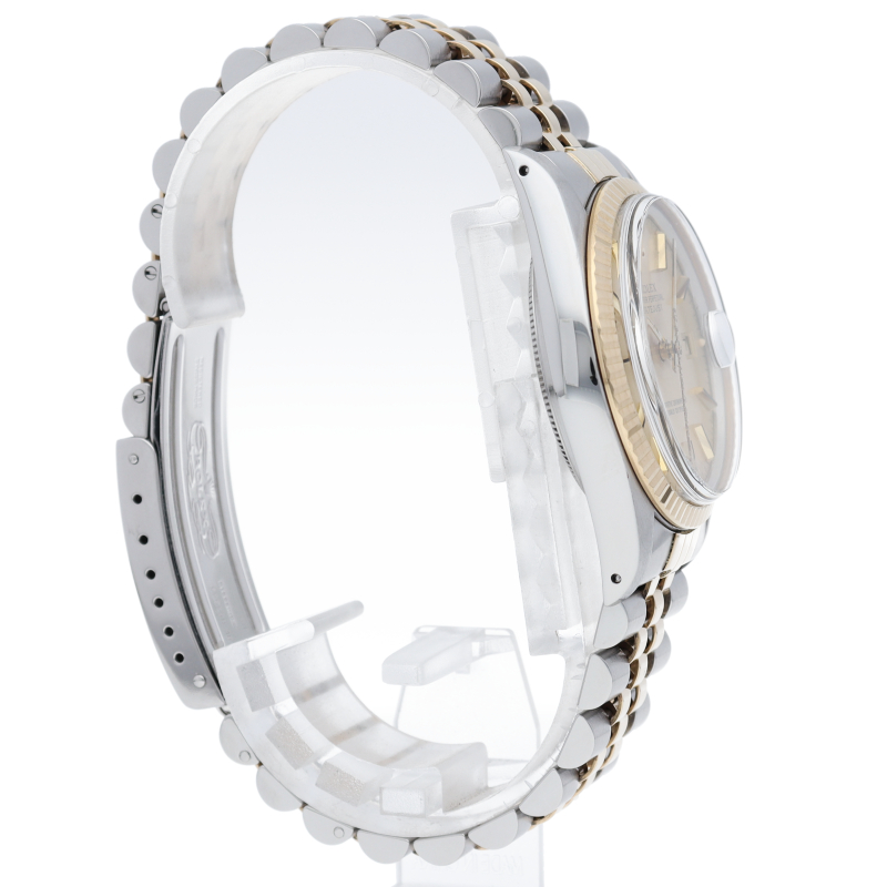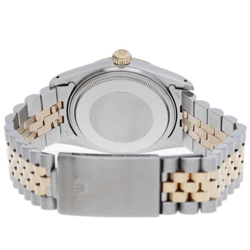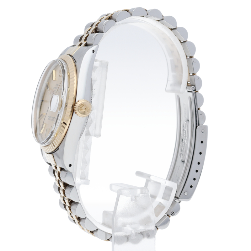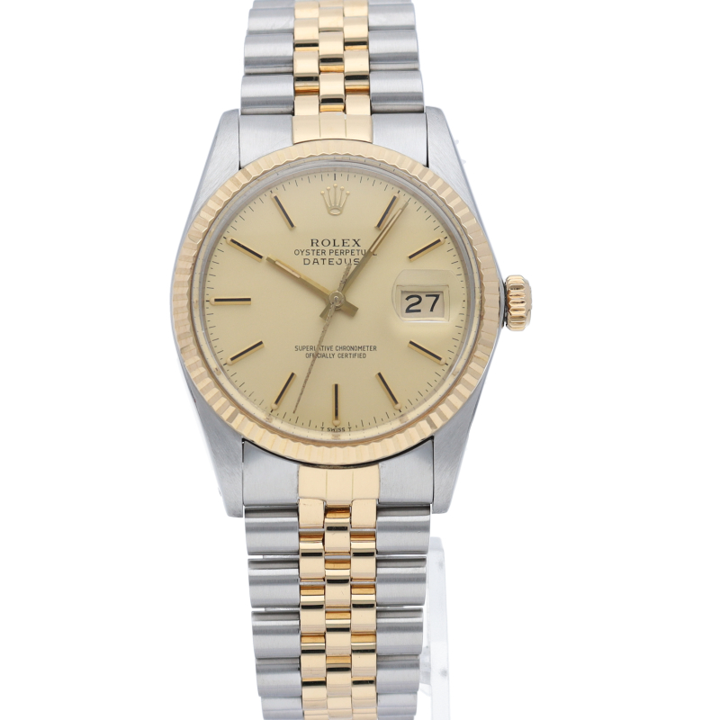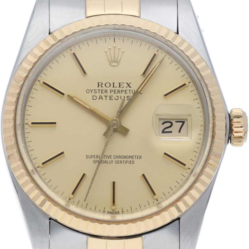 ロレックスドレスウォッチの王道「デイトジャスト」。イエローゴールドとステンレスの組み合わせが高級感を感じさせる1本です。プラスチック風防仕様。
