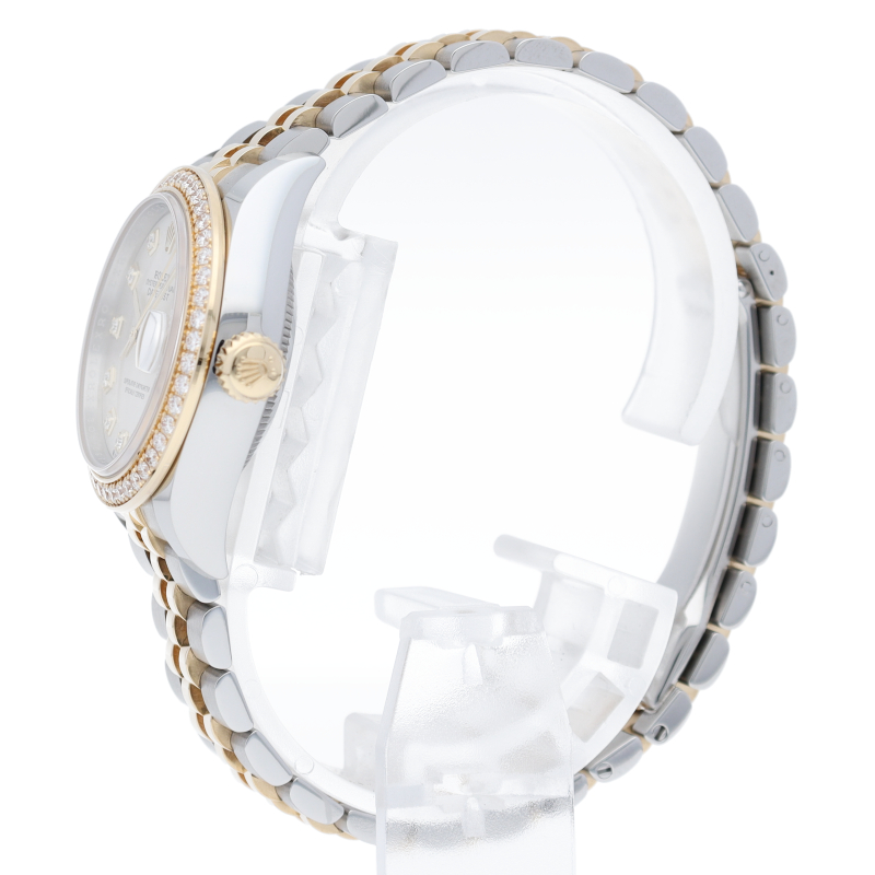 レディース・ロレックスの定番モデルとも言える「デイトジャスト」。こちらはスチールとエバーローズゴールドのコンビモデルで、ベゼルにセッティングされたダイヤモンドの煌きが美しいモデルです。ロレックスが特許を取得したシリコン製シロシキ・ヘアスプリングを備えたCal.2236を搭載。パワーリザーブは約55時間です。
