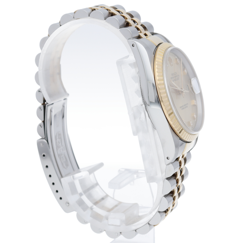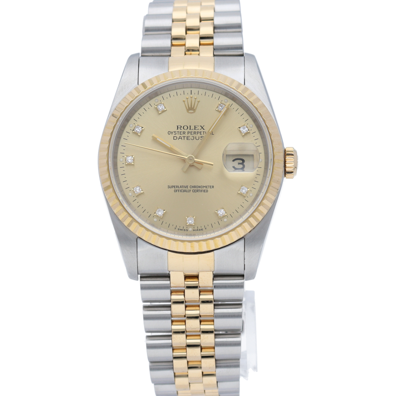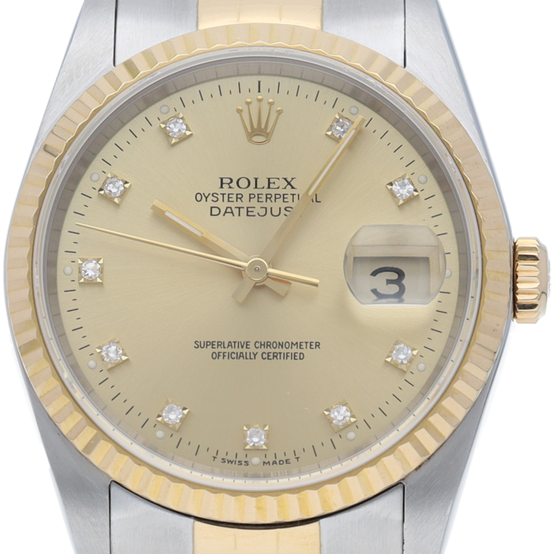 ロレックスのドレスウォッチで幅広い年齢層に愛されている「デイトジャスト」。イエローゴールドとステンレスのコンビ仕様に10Pダイヤが施されております。