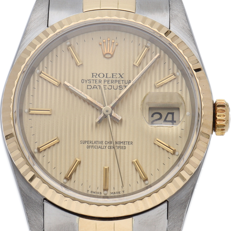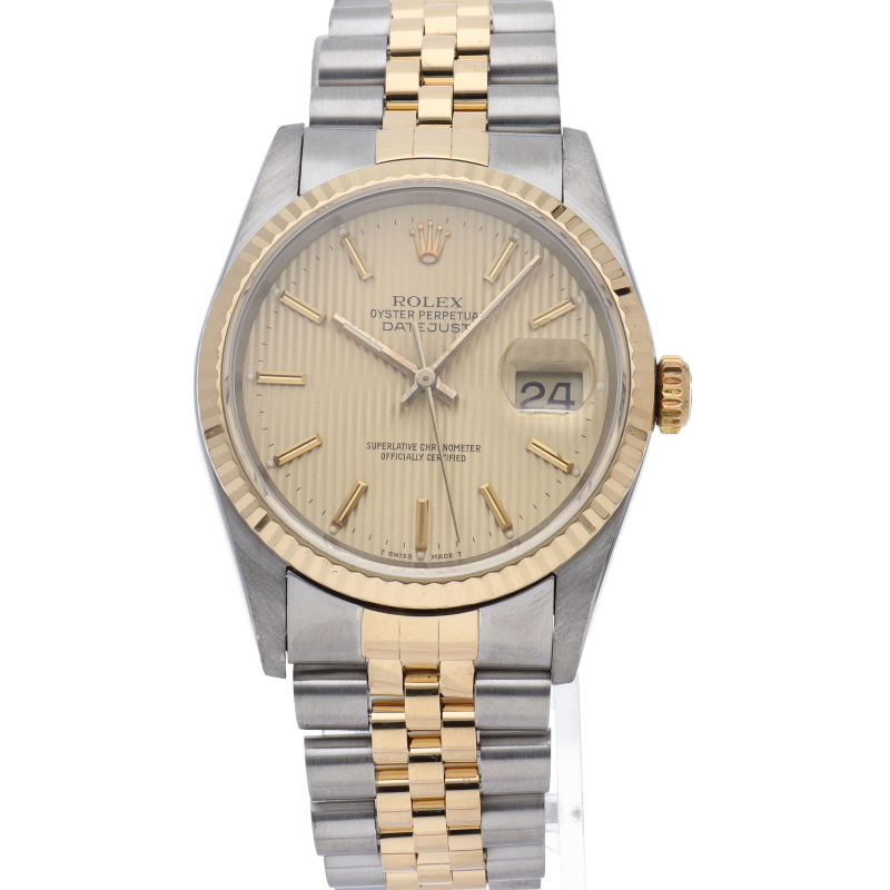 ロレックスのドレスウォッチの王道「デイトジャスト」。イエローゴールドとステンレスの組み合わせが上品で高級感を感じさせる1本です。