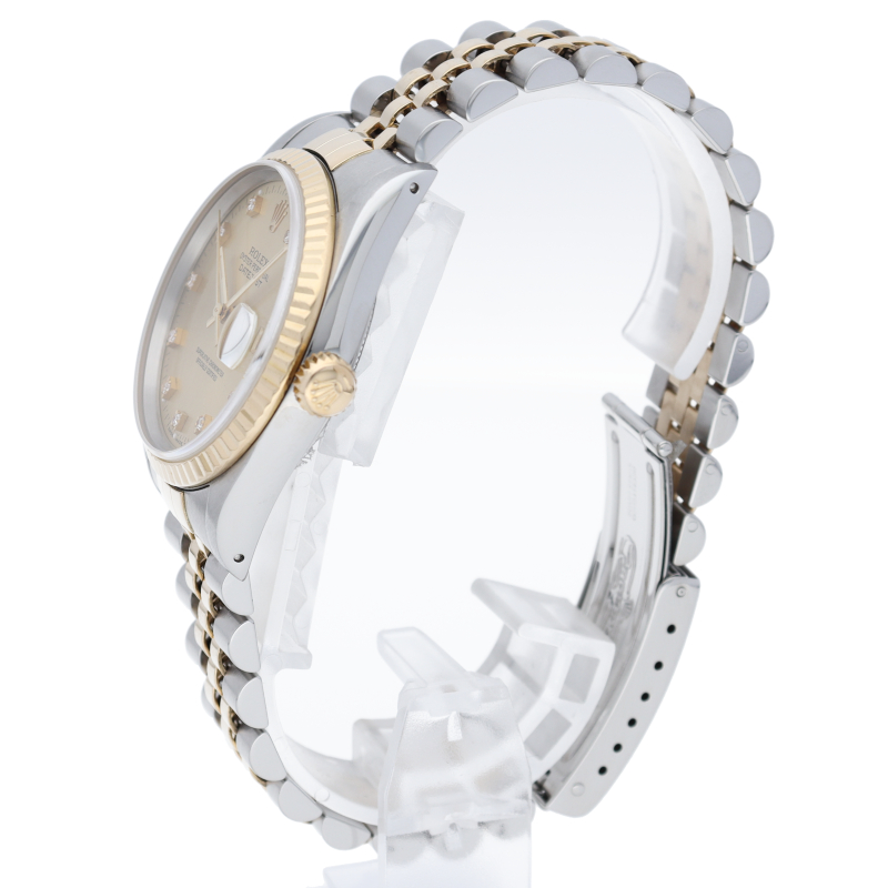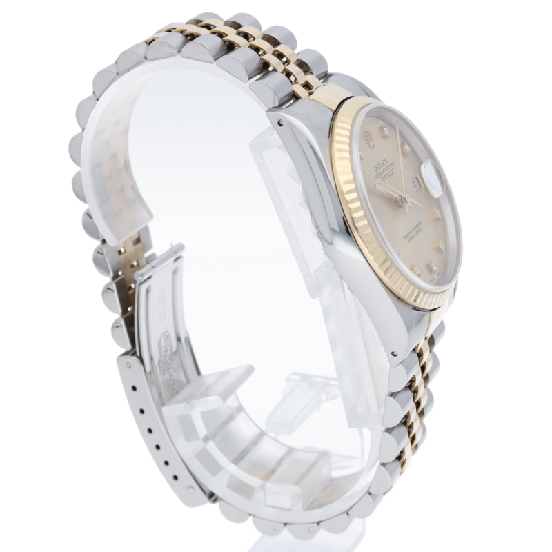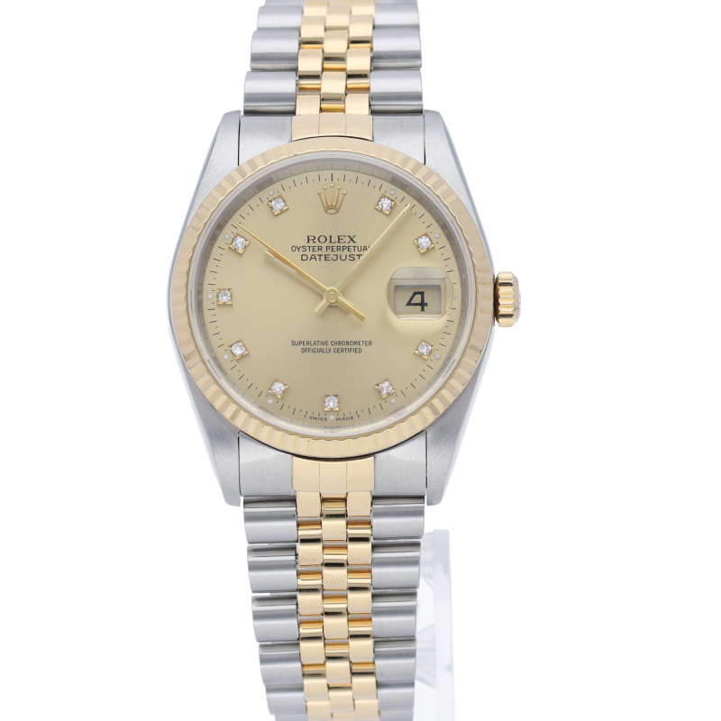 ロレックスのドレスウォッチで幅広い年齢層に愛されている「デイトジャスト」。イエローゴールドとステンレスのコンビ仕様に10Pダイヤが施されております。