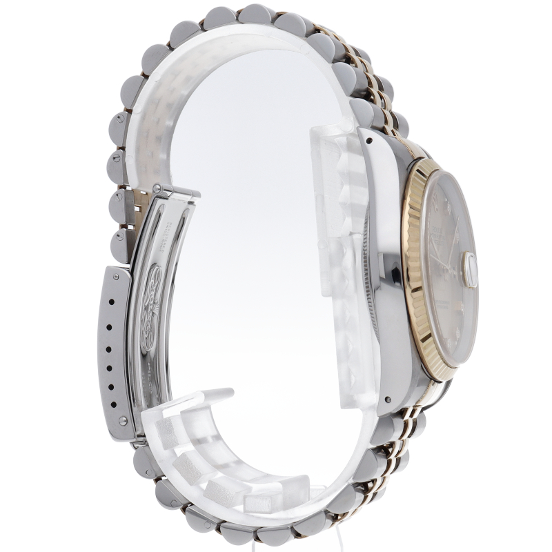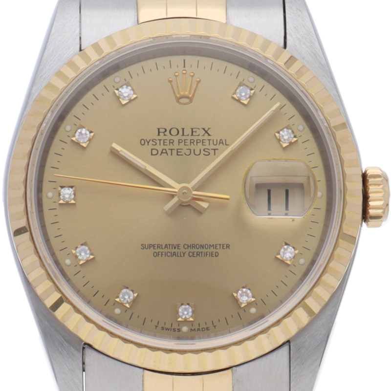 ロレックスのドレスウォッチで幅広い年齢層に愛されている「デイトジャスト」。イエローゴールドとステンレスのコンビ仕様に10Pダイヤが施されております。