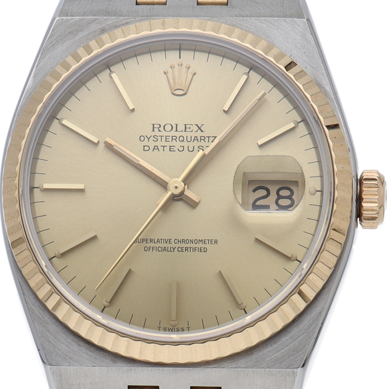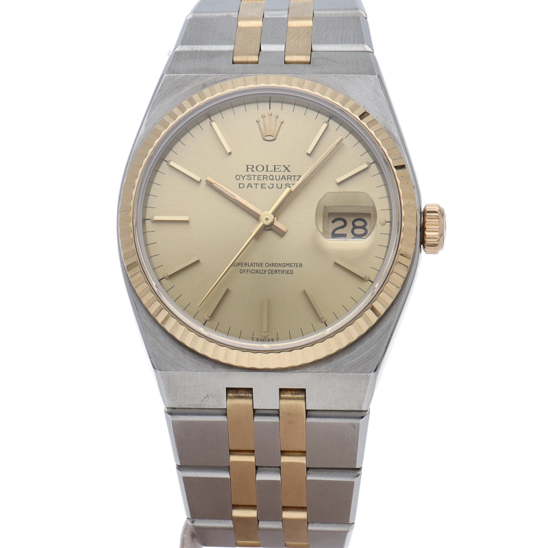 「デイトジャスト」のクォーツ仕様という珍しいモデルで「オイスタークォーツ」です。現行にはない直線的なケースとブレスのフォルムが印象的で貴重な1本。
