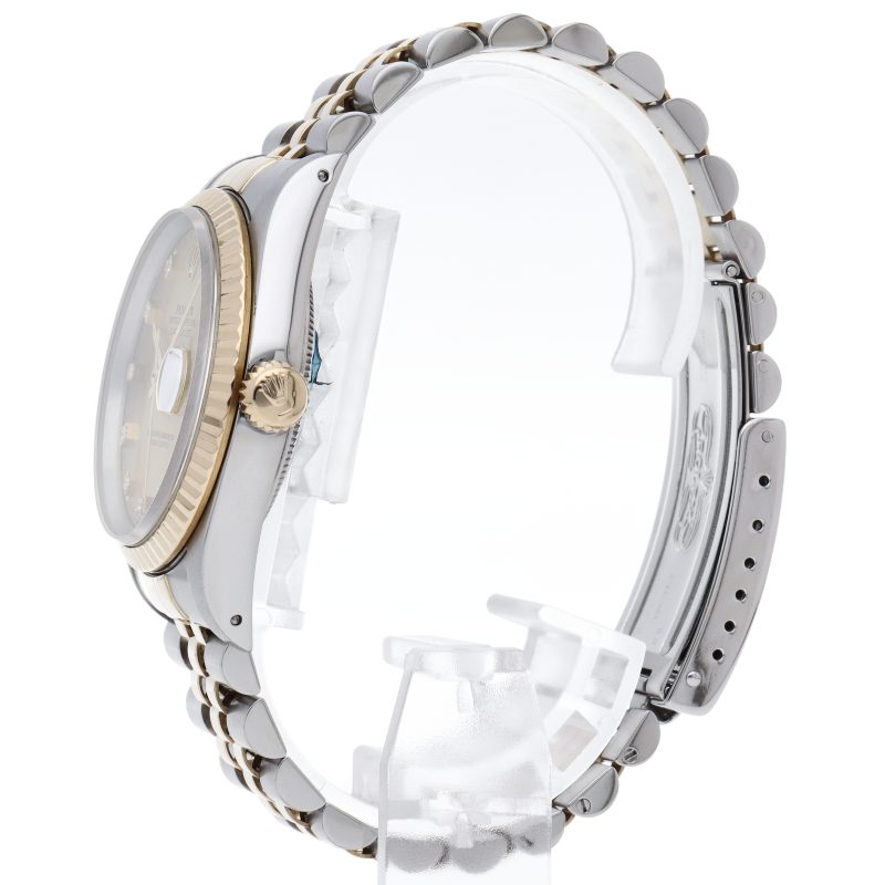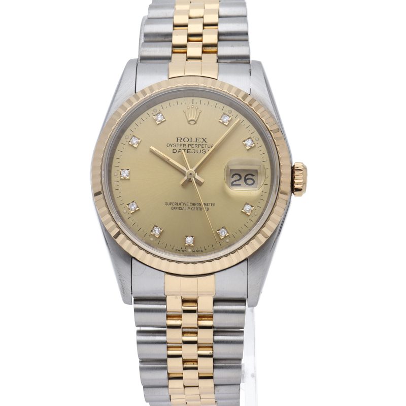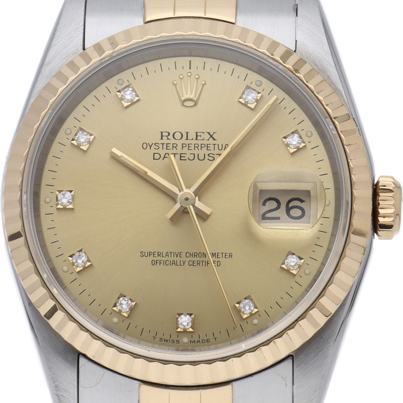 ロレックスのドレスウォッチで幅広い年齢層に愛されている「デイトジャスト」。イエローゴールドとステンレスのコンビ仕様に10Pダイヤが施されております。