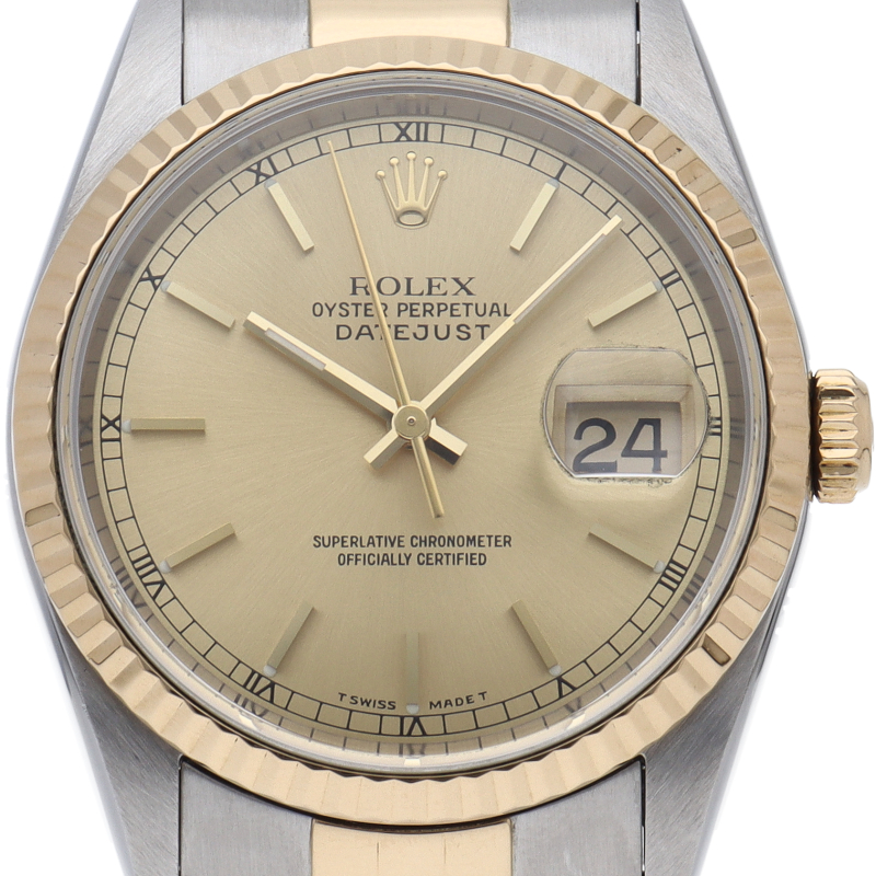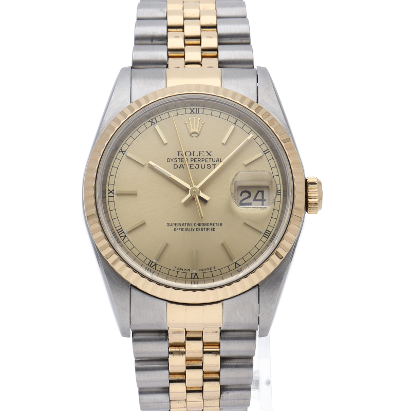 ロレックスのドレスウォッチの王道「デイトジャスト」。イエローゴールドとステンレスの組み合わせが上品で高級感を感じさせる1本です。