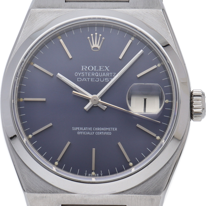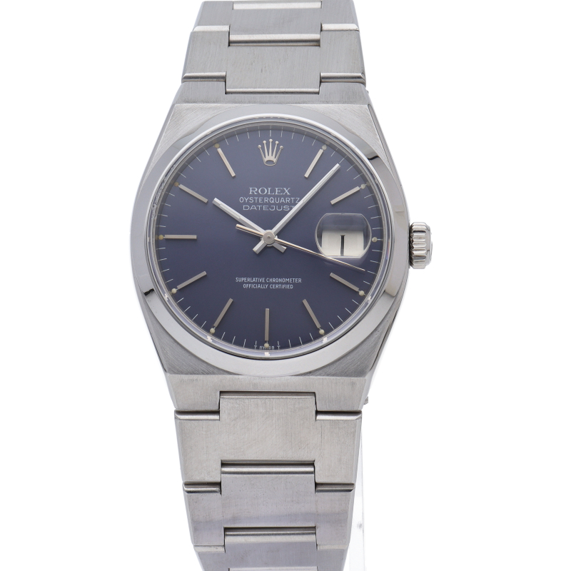 「デイトジャスト」のクォーツ仕様という珍しいモデルで「オイスタークォーツ」です。現行にはない直線的なケースとブレスのフォルムが印象的で貴重な1本。