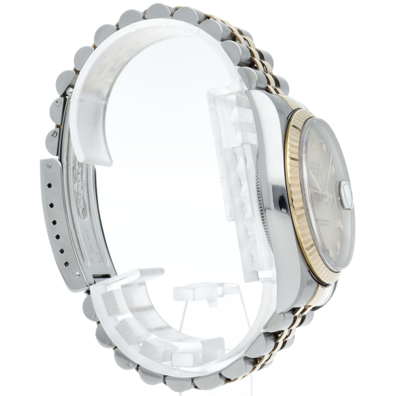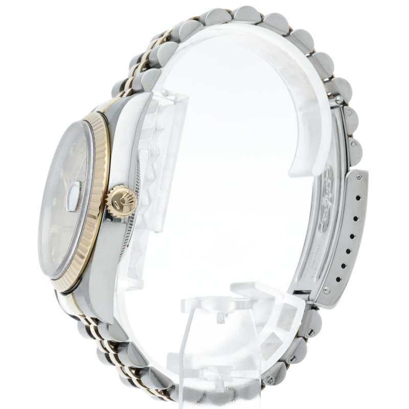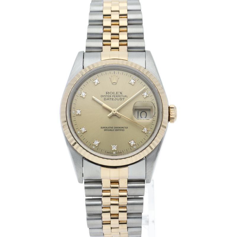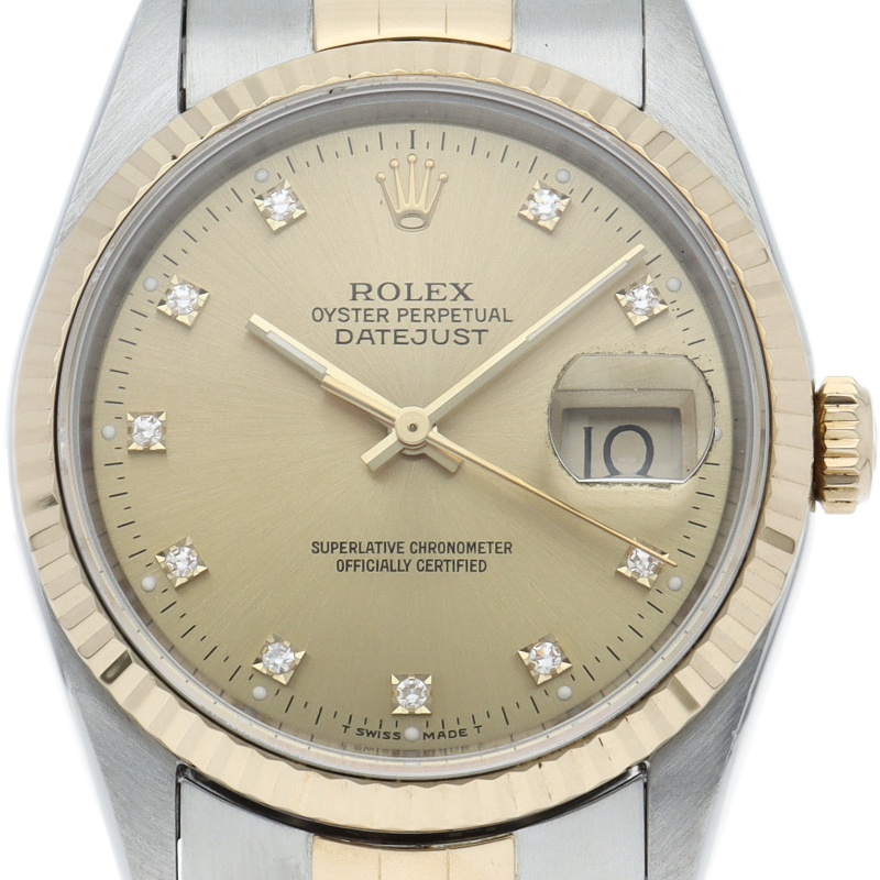 ロレックスのドレスウォッチで幅広い年齢層に愛されている「デイトジャスト」。イエローゴールドとステンレスのコンビ仕様に10Pダイヤが施されております。