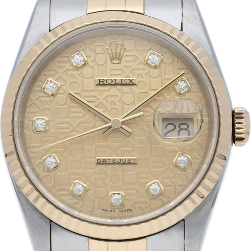 ロレックスのドレスウォッチで幅広い年齢層に愛されている「デイトジャスト」。イエローゴールドとステンレスのコンビ仕様に10Pダイヤが施されております。