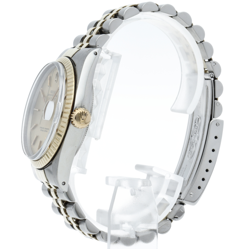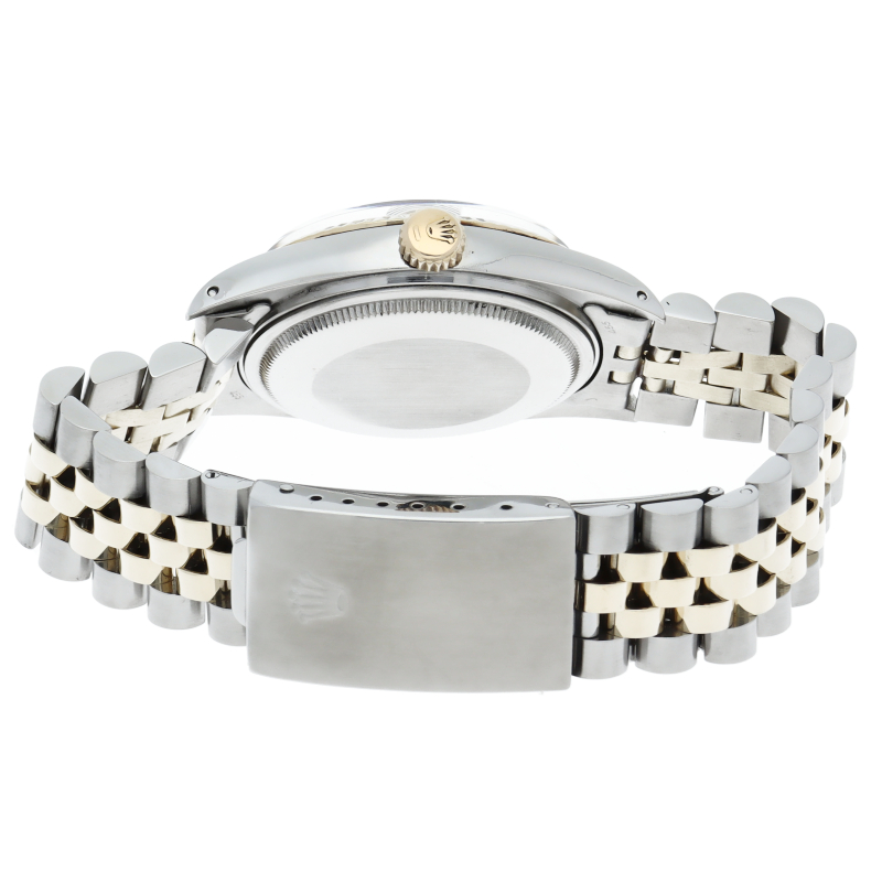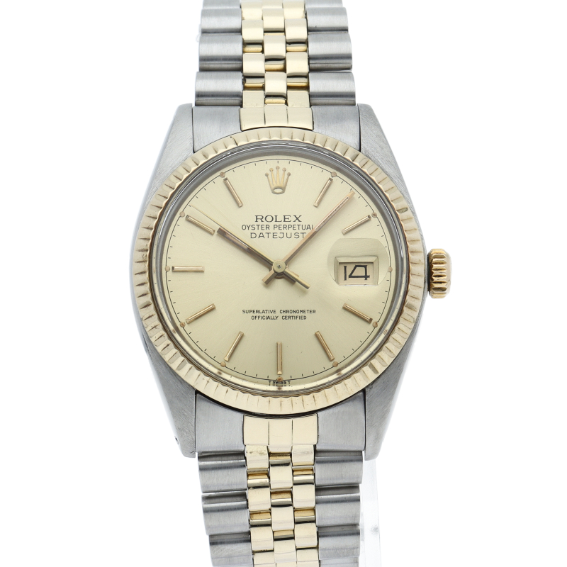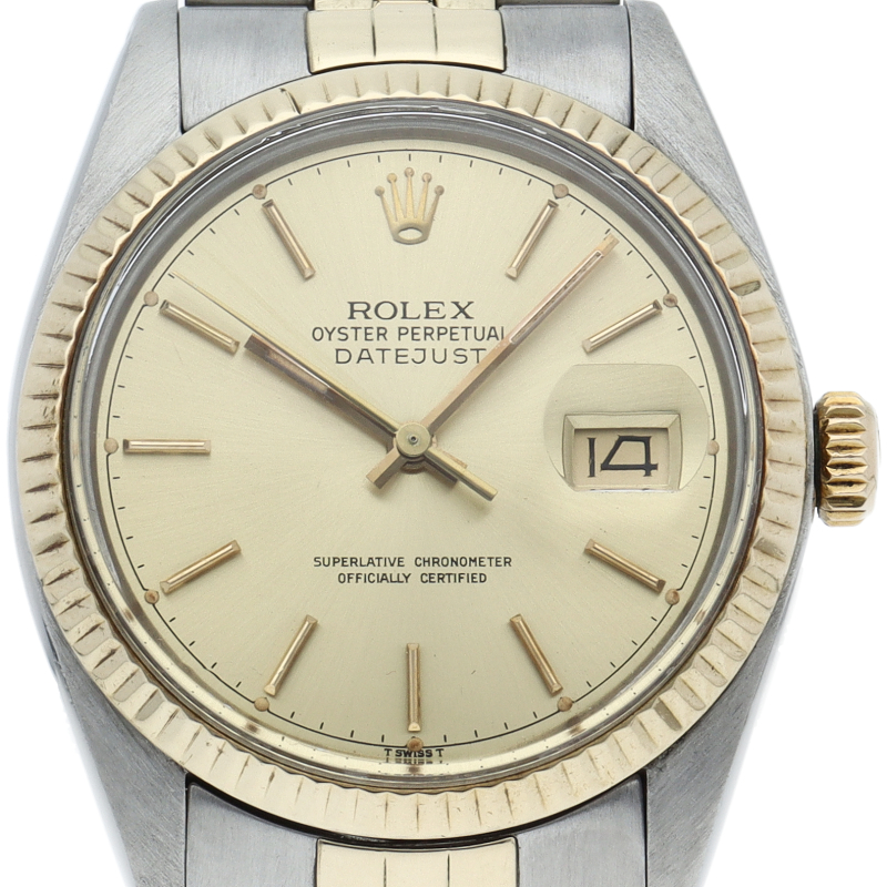 ロレックスドレスウォッチの王道「デイトジャスト」。イエローゴールドとステンレスの組み合わせが高級感を感じさせる1本です。プラスチック風防仕様。