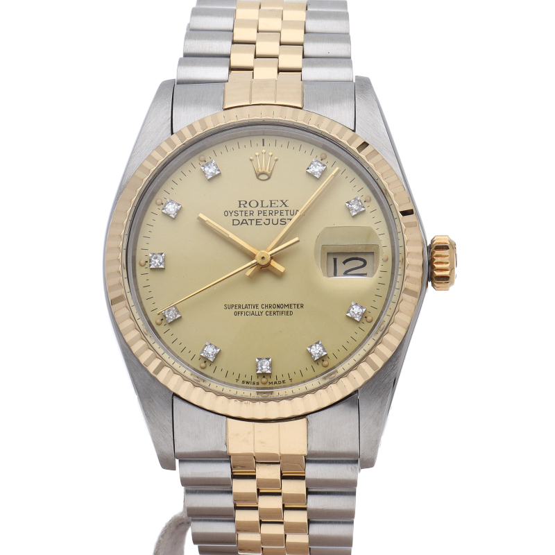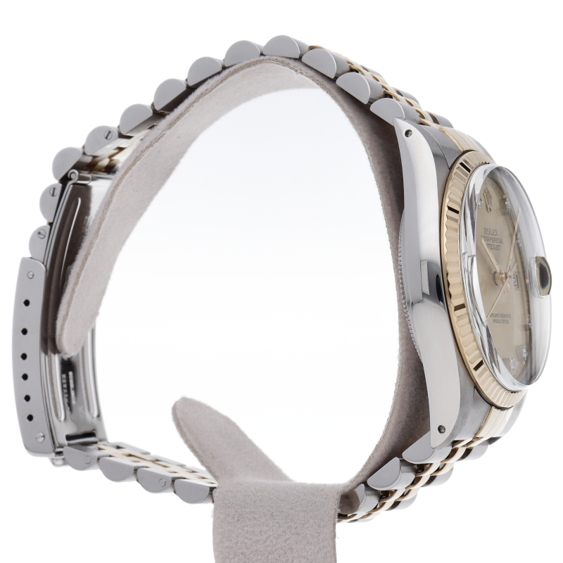 ロレックスドレスウォッチの王道「デイトジャスト」。イエローゴールドとステンレスのコンビ仕様に10Pダイヤが施されております。