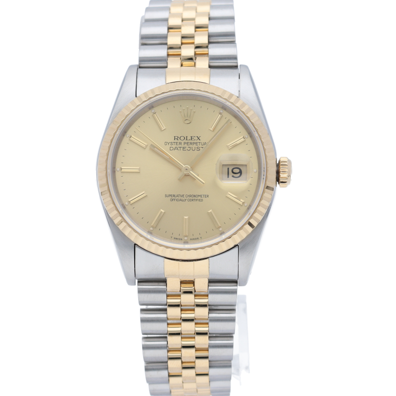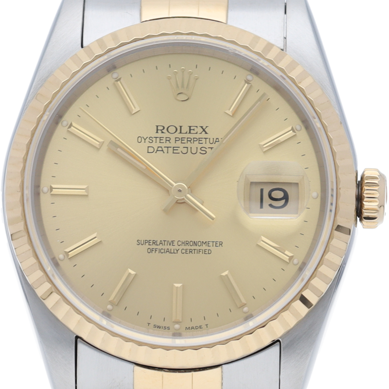 ロレックスのドレスウォッチの王道「デイトジャスト」。イエローゴールドとステンレスの組み合わせが上品で高級感を感じさせる1本です。