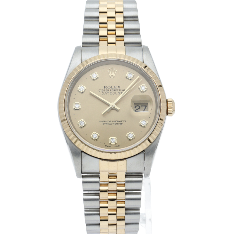 ロレックスのドレスウォッチで幅広い年齢層に愛されている「デイトジャスト」。イエローゴールドとステンレスのコンビ仕様に10Pダイヤが施されております。