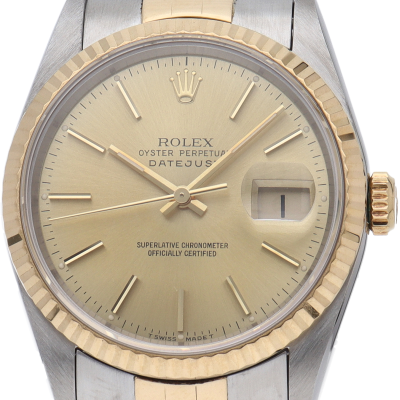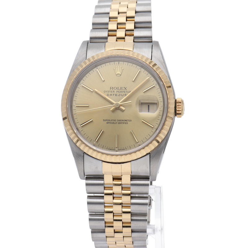 ロレックスのドレスウォッチの王道「デイトジャスト」。イエローゴールドとステンレスの組み合わせが上品で高級感を感じさせる1本です。