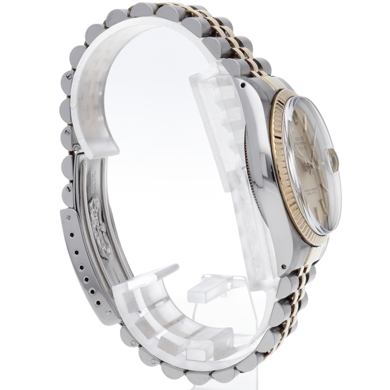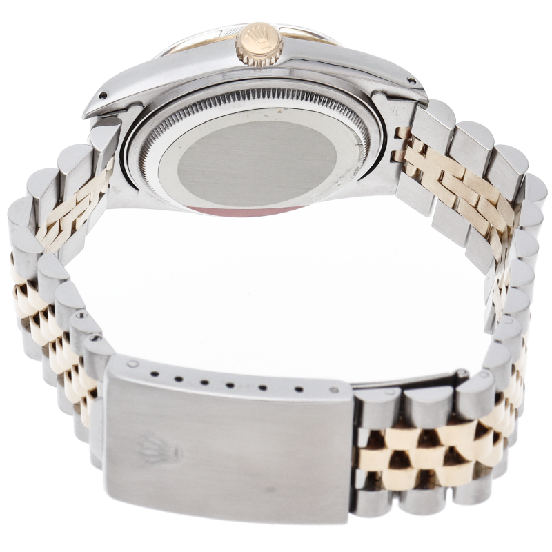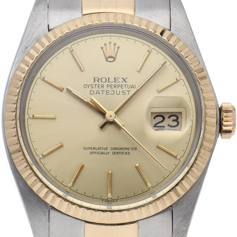 ロレックスドレスウォッチの王道「デイトジャスト」。イエローゴールドとステンレスの組み合わせが高級感を感じさせる1本です。プラスチック風防仕様。