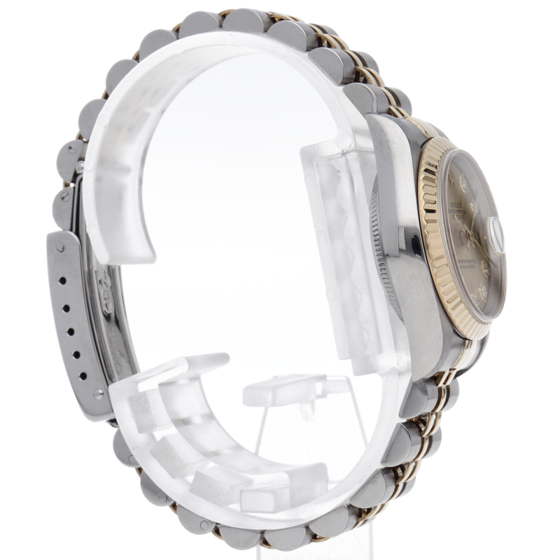 ロレックスのドレスウォッチで幅広い年齢層に愛されているデイトジャスト。イエローゴールドとステンレスのコンビ仕様に10Pダイヤが施され豪華です。