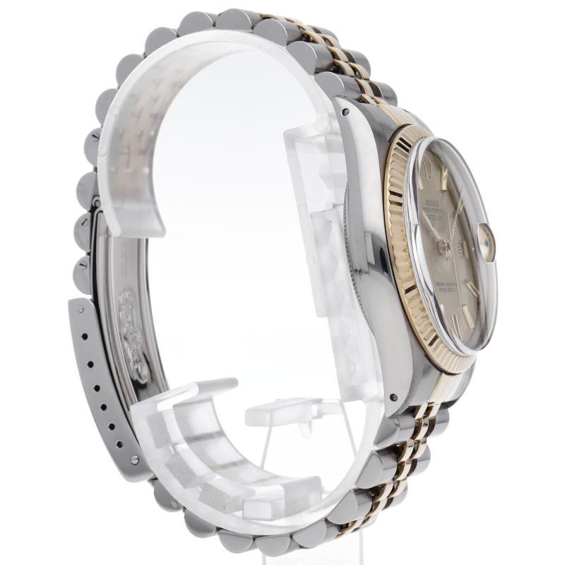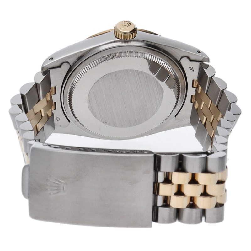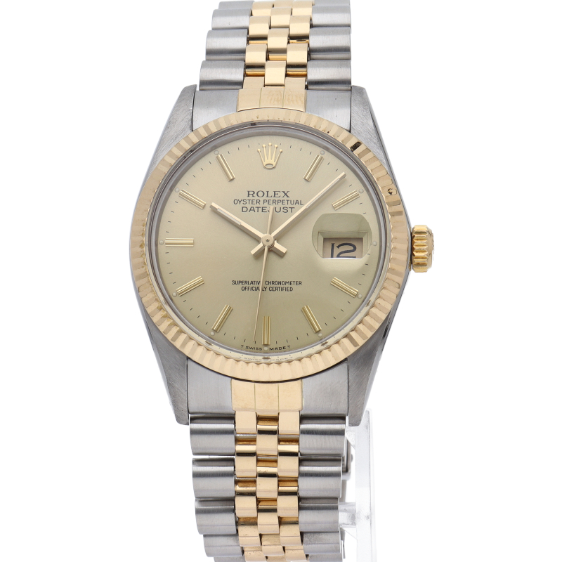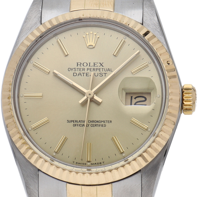 ロレックスドレスウォッチの王道「デイトジャスト」。イエローゴールドとステンレスの組み合わせが高級感を感じさせる1本です。プラスチック風防仕様。