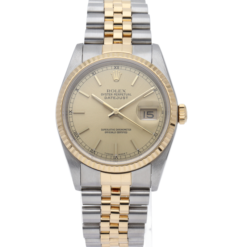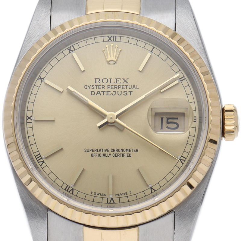 ロレックスのドレスウォッチの王道「デイトジャスト」。イエローゴールドとステンレスの組み合わせが上品で高級感を感じさせる1本です。