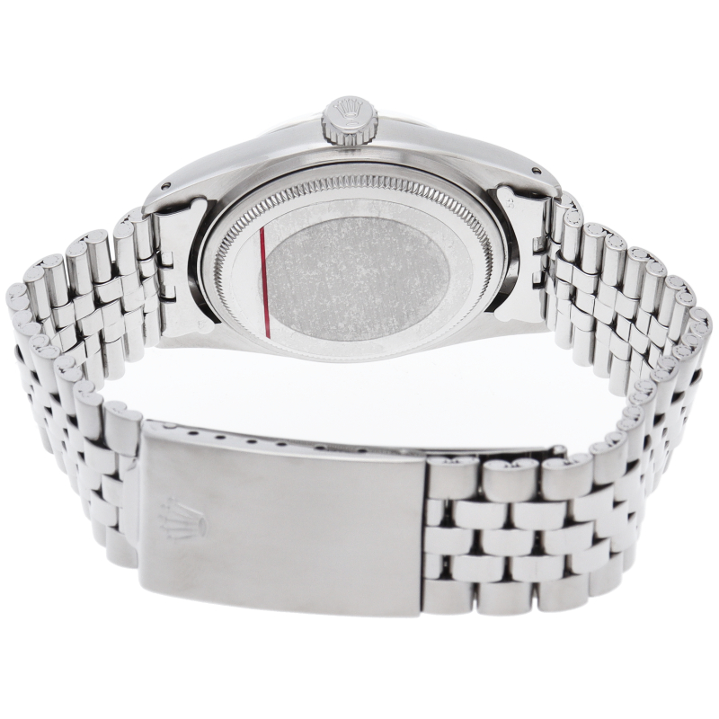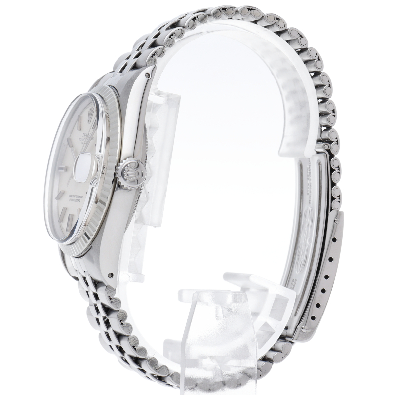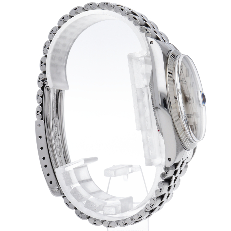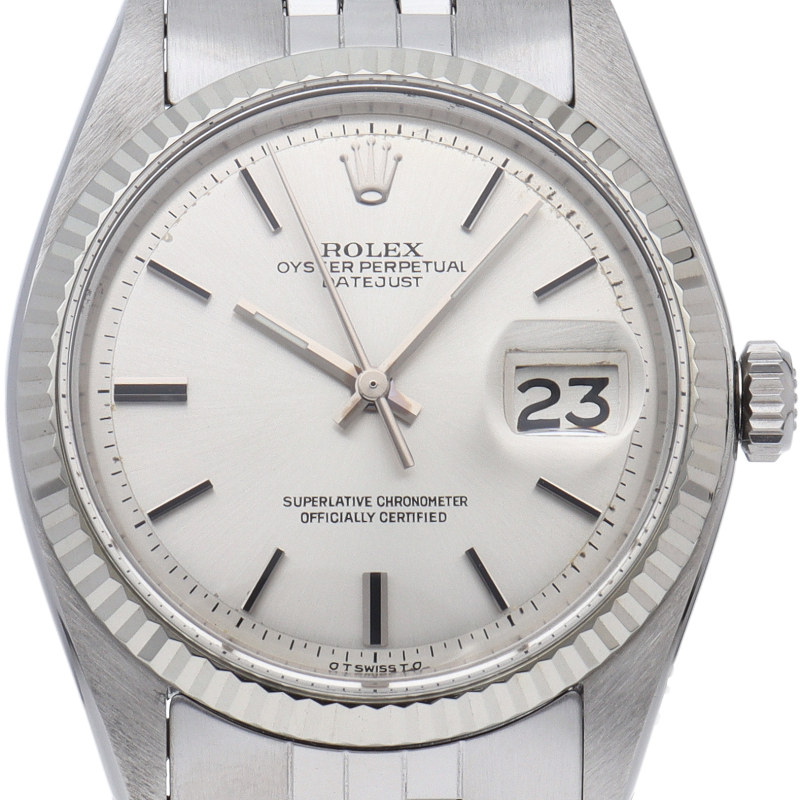 ロレックスのドレスウォッチの王道「デイトジャスト」。ホワイトゴールドとステンレスの組み合わせが高級感を感じさせる1本です。プラスチック風防仕様。6時位置にインデックス等に貴金属が使用されている事を表すシグママークが入った、希少性・高級感の非常に高い1本です。