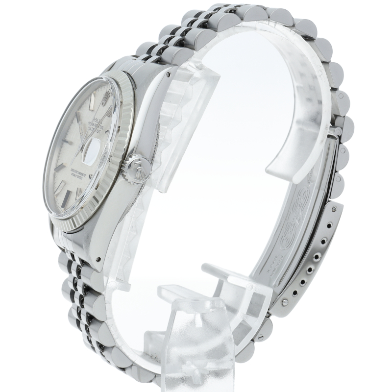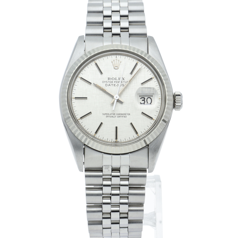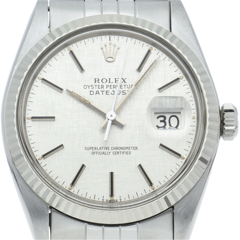 ロレックスのドレスウォッチの王道「デイトジャスト」。ホワイトゴールドとステンレスの組み合わせが高級感を感じさせる1本です。モザイク文字盤。