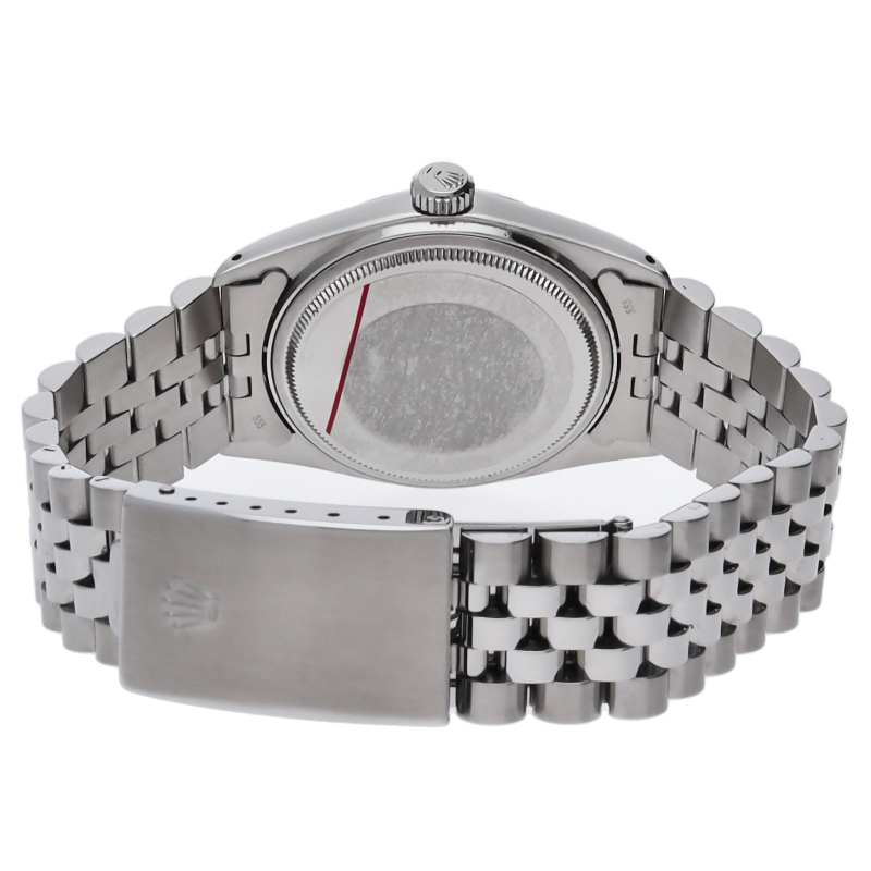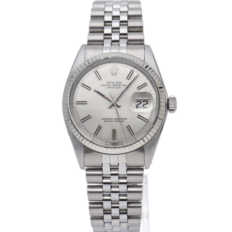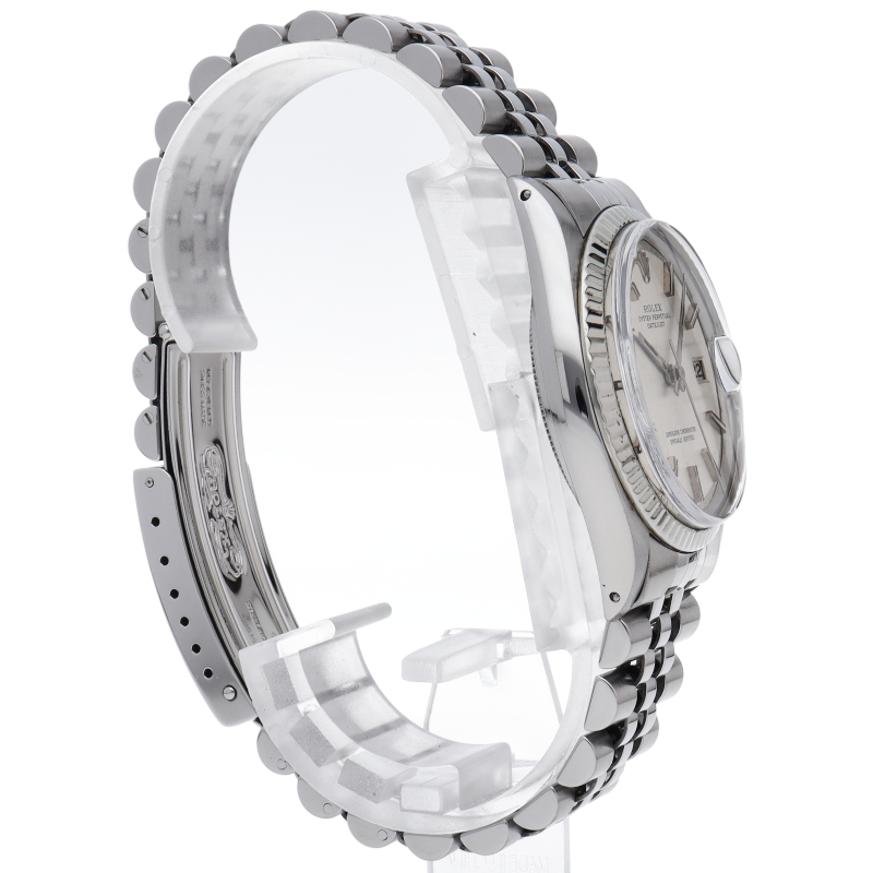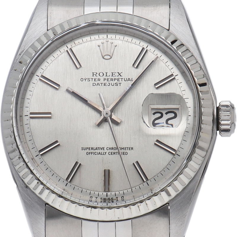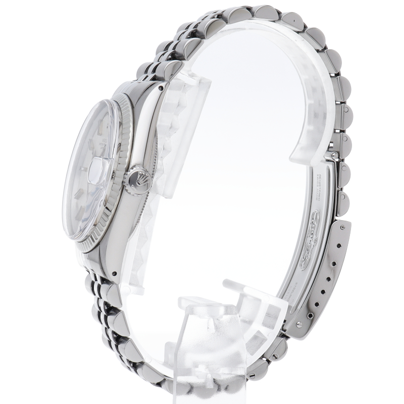 ロレックスのドレスウォッチの王道「デイトジャスト」。ホワイトゴールドとステンレスの組み合わせが高級感を感じさせる1本です。プラスチック風防仕様。6時位置にインデックス等に貴金属が使用されている事を表すシグママークが入った、希少性・高級感の非常に高い1本です。