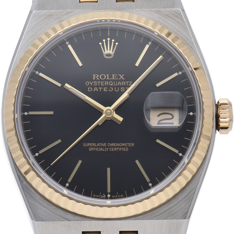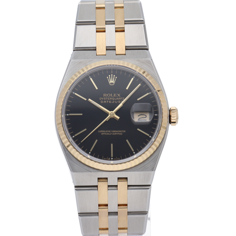 「デイトジャスト」のクォーツ仕様という珍しいモデルで「オイスタークォーツ」です。現行にはない直線的なケースとブレスのフォルムが印象的で貴重な1本。