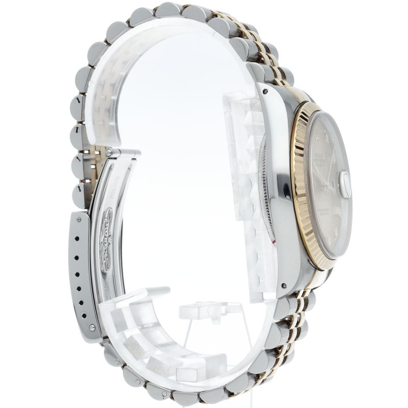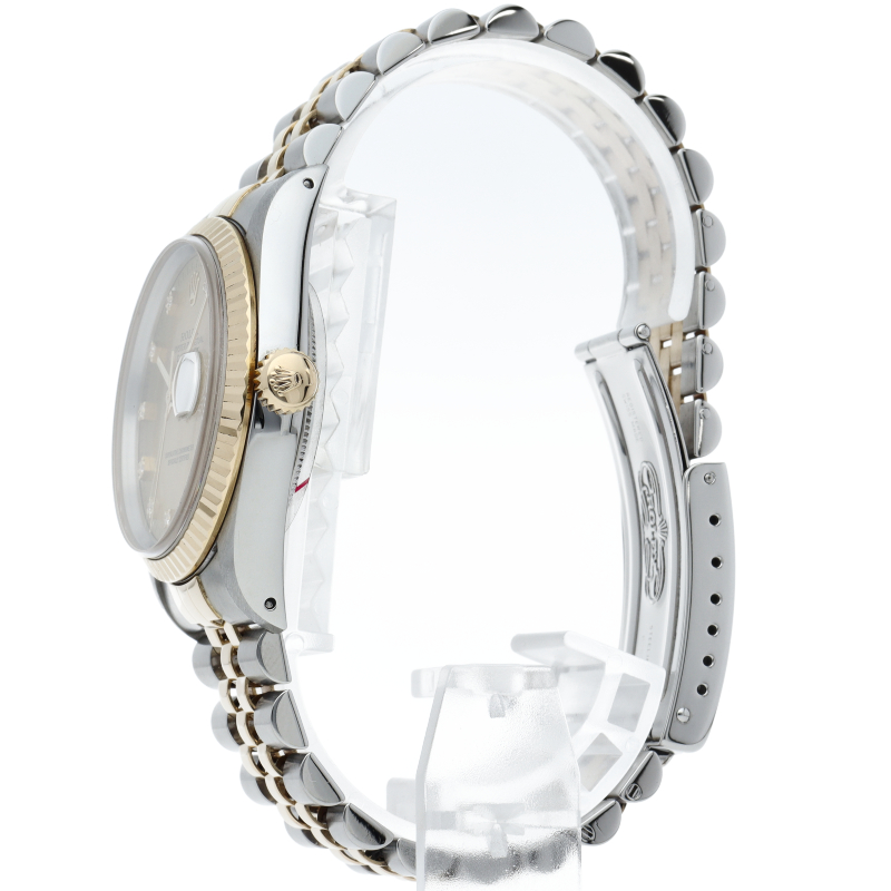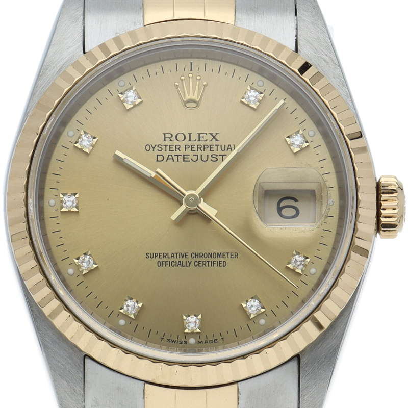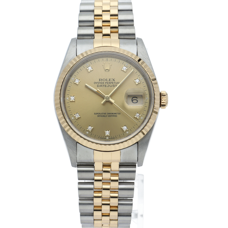 ロレックスのドレスウォッチで幅広い年齢層に愛されている「デイトジャスト」。イエローゴールドとステンレスのコンビ仕様に10Pダイヤが施されております。